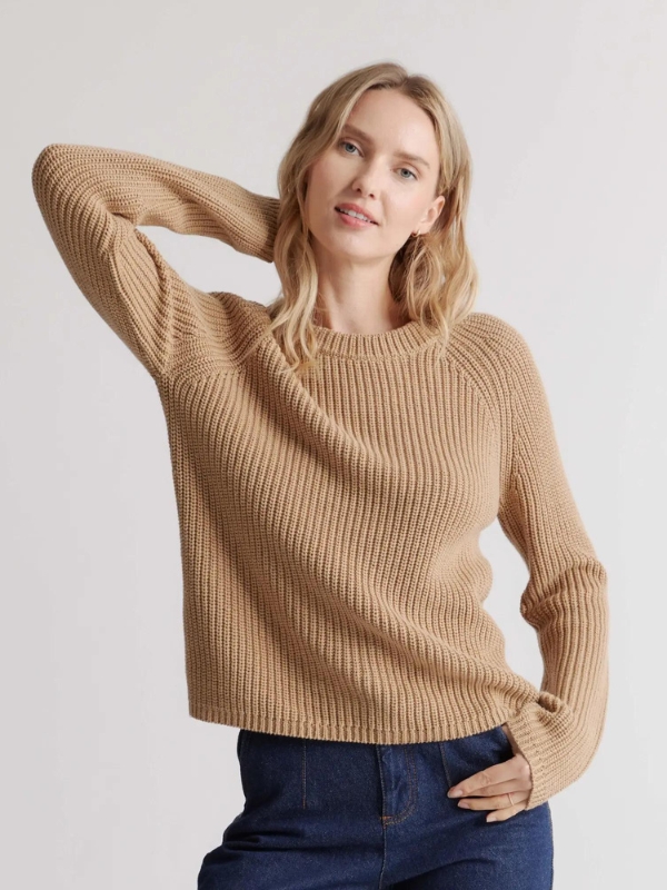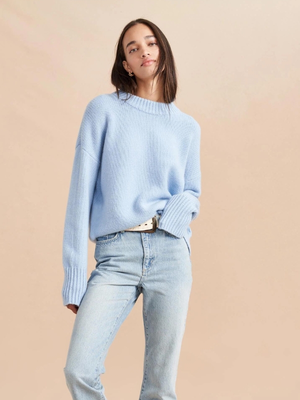 Do you want to wear a pleasant, beige ribbed sweater? They are a timeless and comfortable classic. The ensemble, tucked into a pair of straight-leg, high-waisted blue jeans, has a carefree but polished attitude that makes it ideal for a smart-casual office.