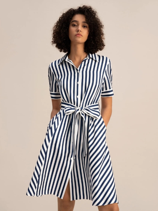This ensemble is the epitome of the perfect athletic workwear. The shirt dress gives off a polished look due to its well-tailored fit and neat collar, while the stripes inject a little casualness without sacrificing style.