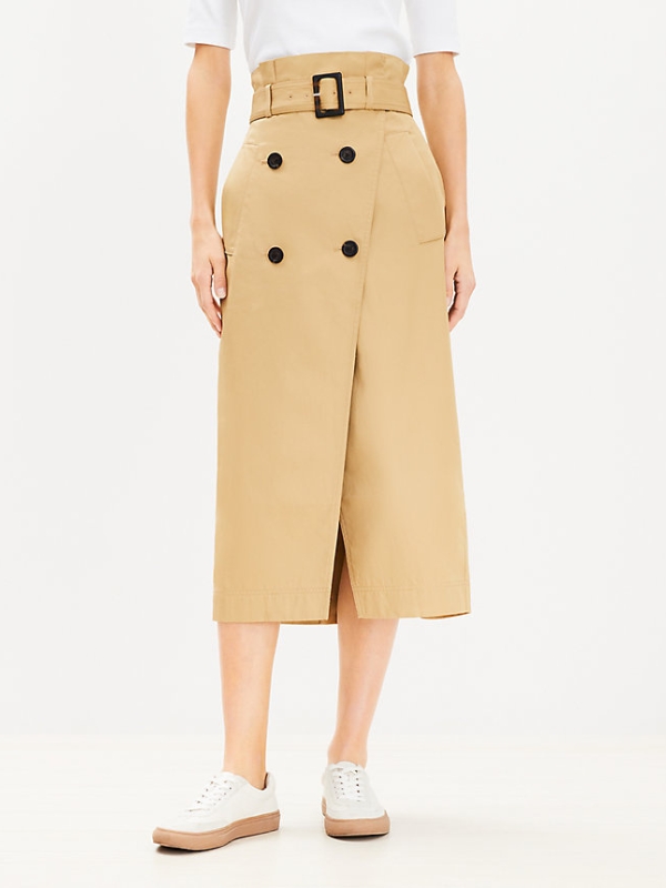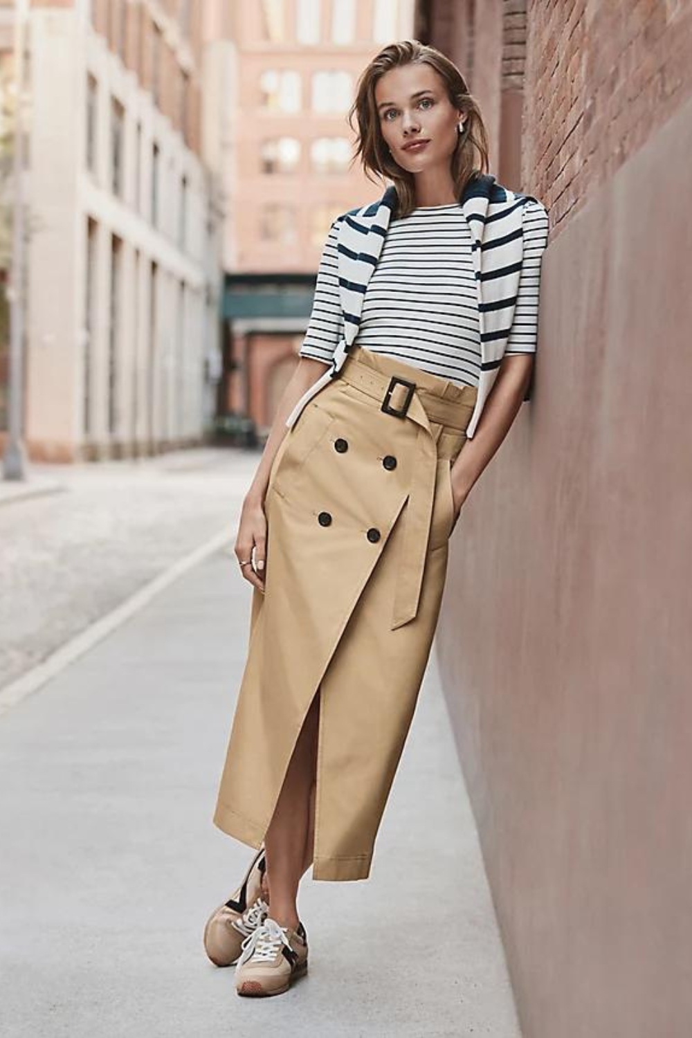 Have you ever used this combination? Although nautical, this attire seamlessly combines traditional and modern elements. Wearing a crew neck and a short-sleeved, blue-and-white striped t-shirt that evokes the classic essence of nautical fashion, The ensemble’s striking double-breasted button style and high-waisted, camel-colored midi skirt combine to create the ideal mix of carefree styling and precise tailoring.