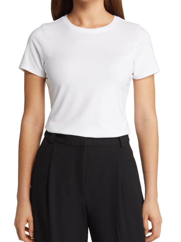 Add a little something? An easy-to-wear tote bag made of brown leather combines style and utility by hanging from one shoulder. It’s fashionable enough to draw attention but roomy enough to accommodate a laptop. And how about adding a pair of tiny hoop earrings for a subdued pop of style? They’ll provide the perfect amount of shine and frame your face.