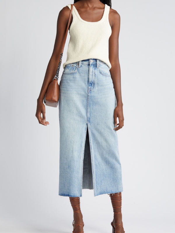 Have you ever wondered how to combine casual and professional in an ideal way? With this effortlessly stylish combo reinventing “sporty workwear,” the secret is finally revealed. Firstly, comes a simple white t-shirt that is the perfect blank canvas for style options. It takes casual denim to a classier level when it’s tucked into a wide-leg, high-waisted denim skirt with an incredible front slit.