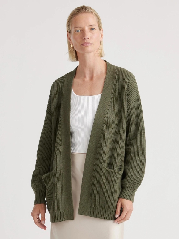 A green cardigan drapes smoothly over a black and white striped turtleneck, which is worn with elegant black slacks and spotless white sneakers. This outfit is a declaration of adaptability, coziness, and unquestionable style rather than merely a fashion statement.