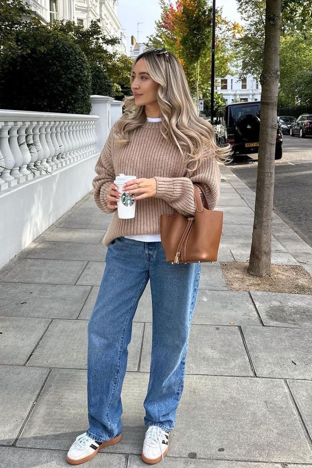T Shirt + Sweater + Straight-Leg Jeans + Sneakers