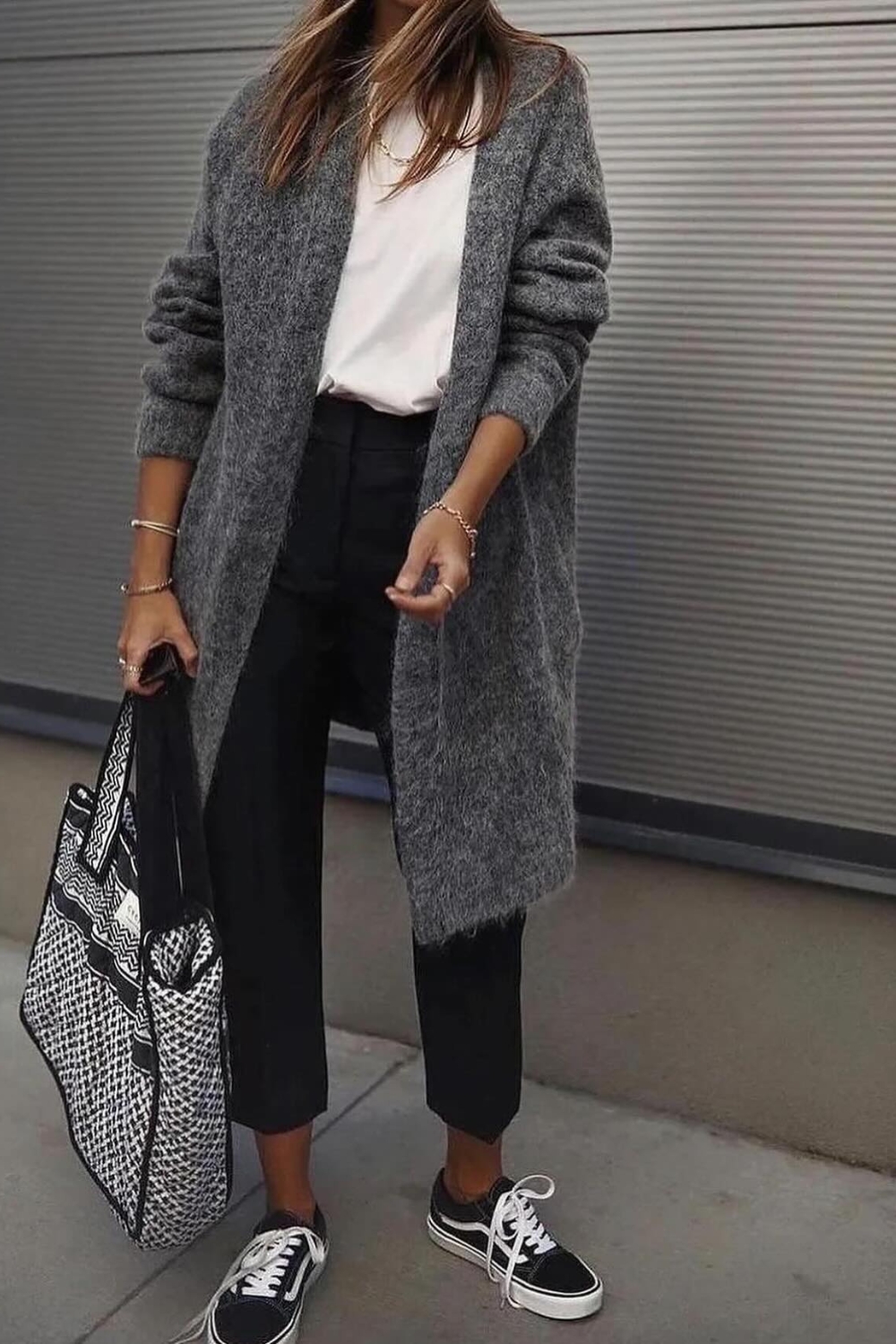 The new power suit is an oversized charcoal gray cardigan with a clean white top. The loose fit of the cardigan exudes coziness, while the blouse maintains a polished appearance.
