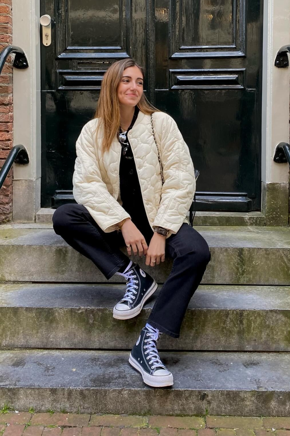 Black Tee + Black Jeans + Quilted Jacket + Converse