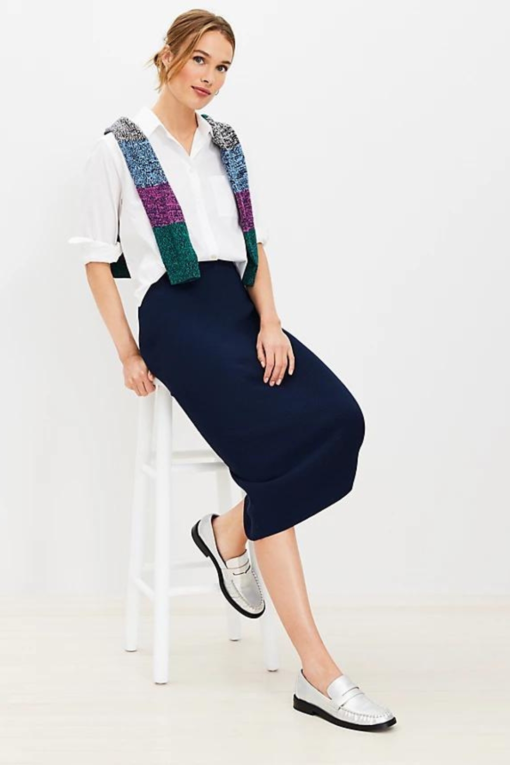 Cardigan + Pencil Skirt + Loafers + Button-Down Shirt