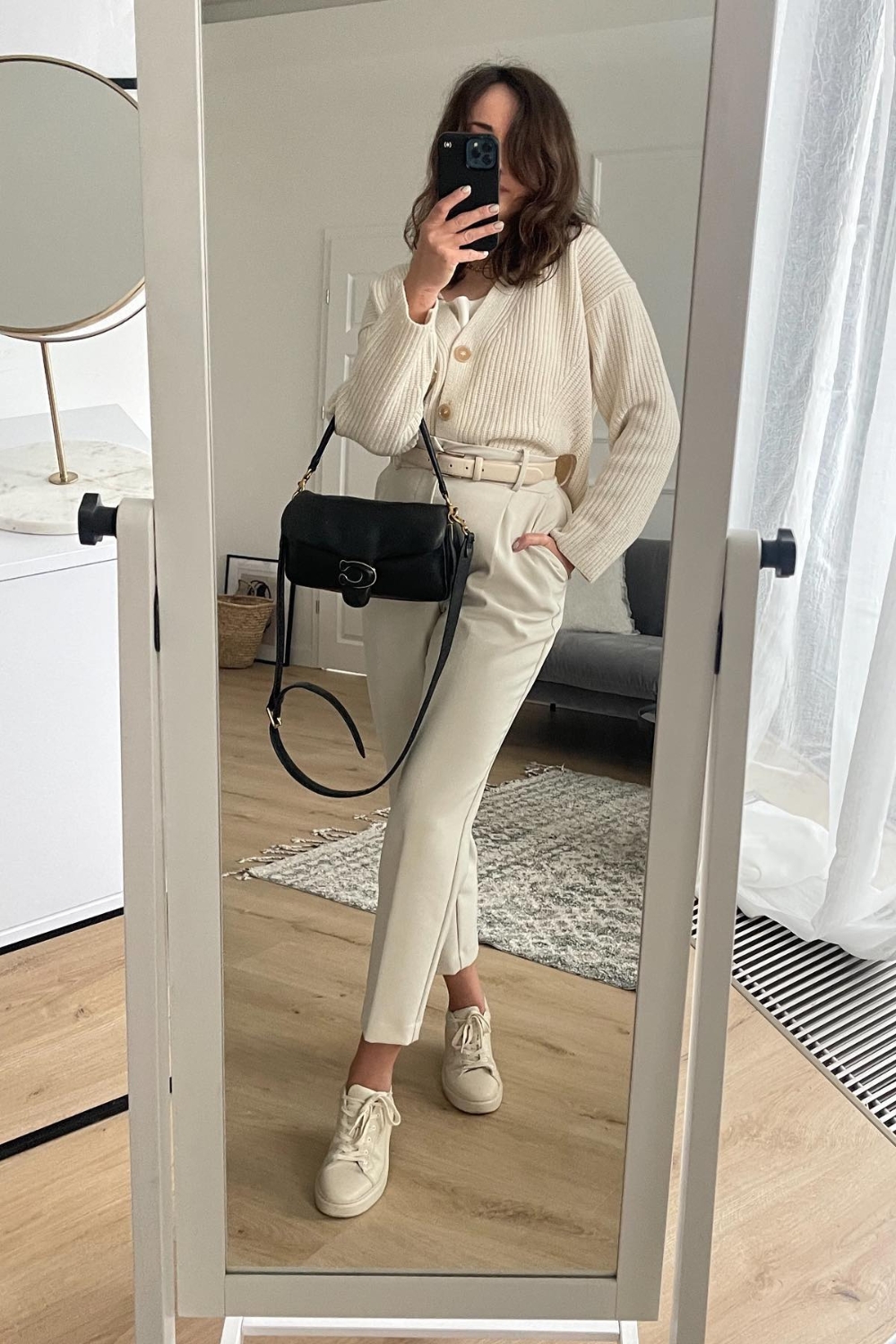 Sneakers? You’ll see matching cream-colored shoes underneath, the perfect fusion of style and utility. Not only are they sneakers, but they also serve as the finishing touch to an ensemble that declares, “I mean business, but I’m also here to enjoy the ride.”