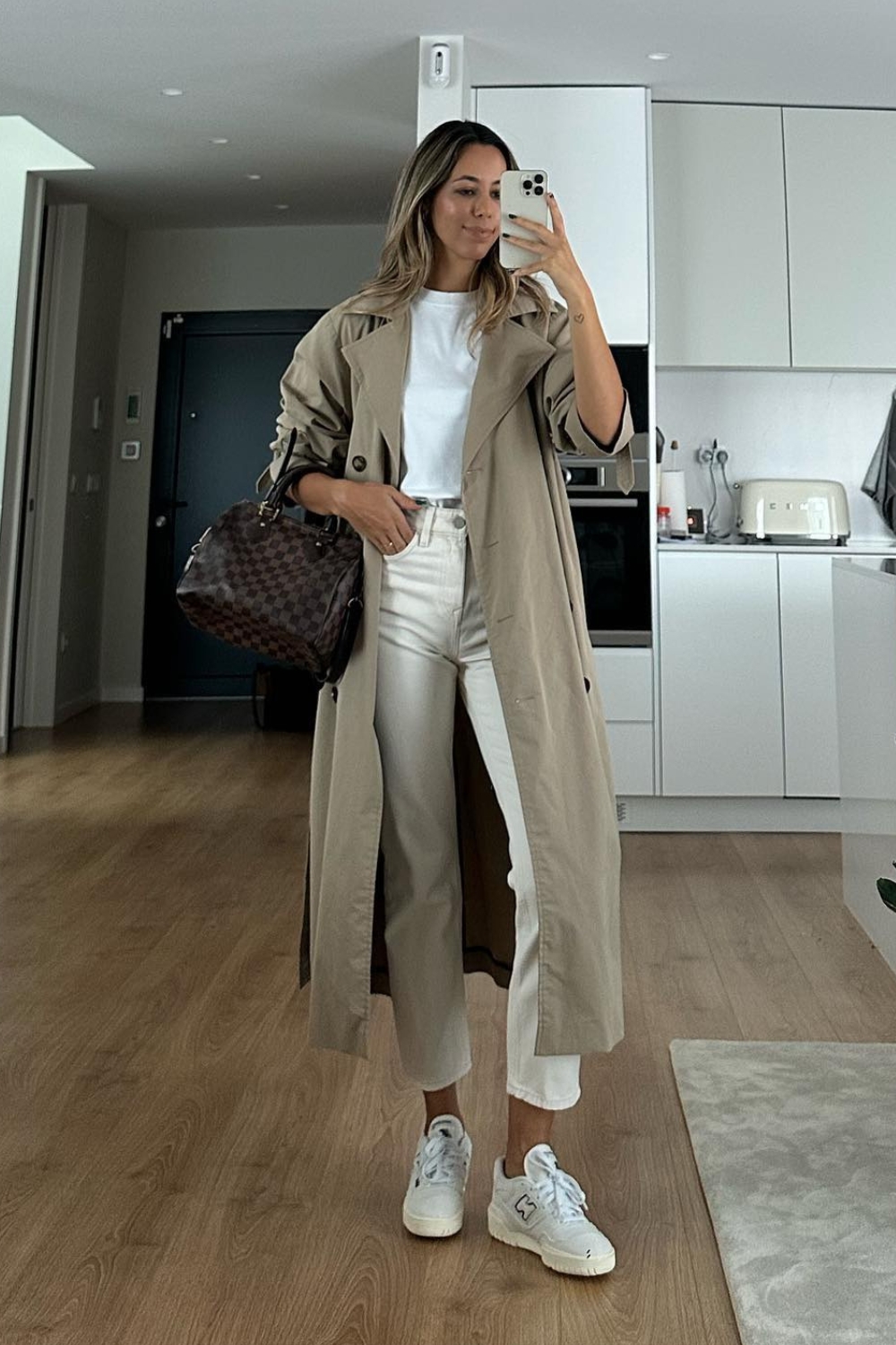 White T-Shirt + White Jeans + Sneakers + Trench Coat