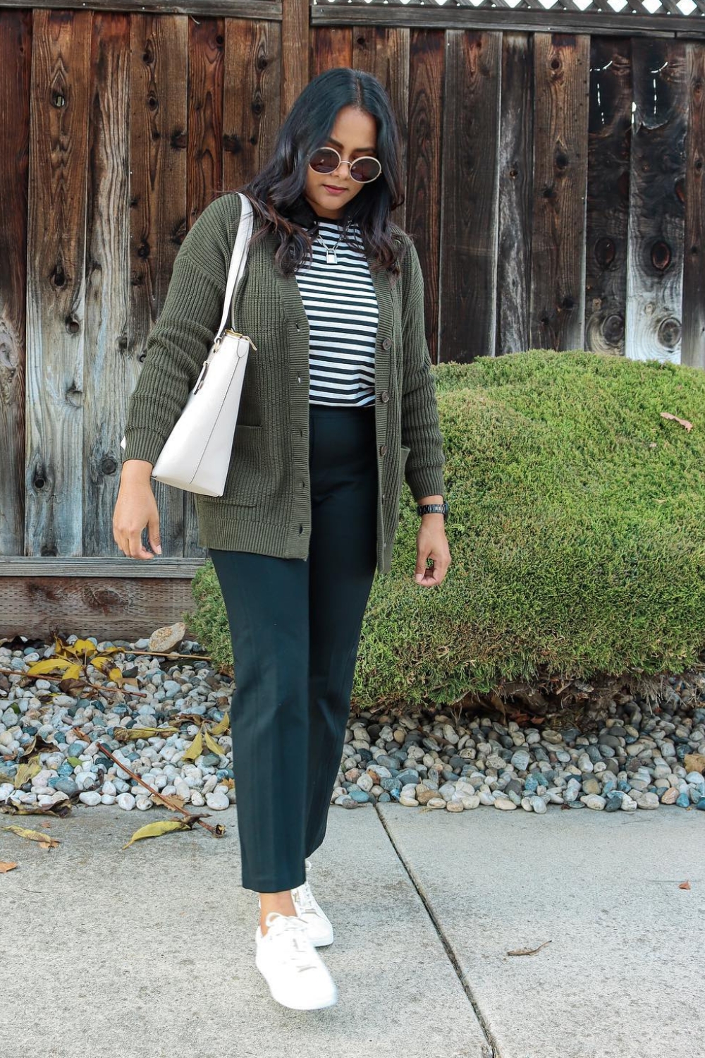 Cardigan + Black Ankle Pants + Striped Tee + Sneakers
