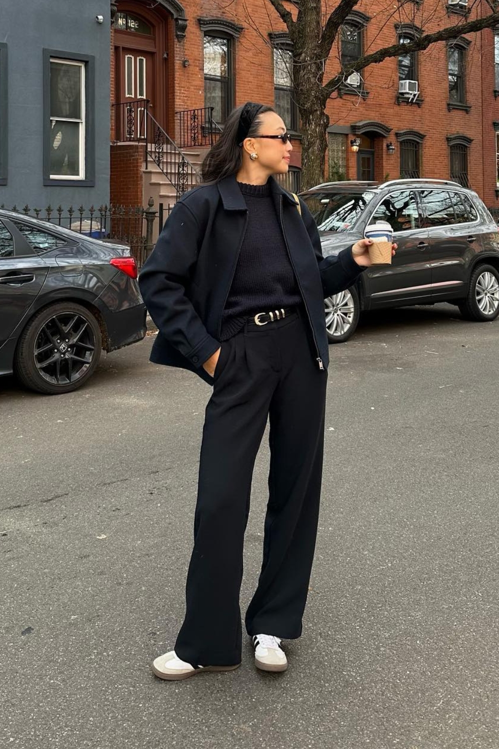 Sweater + Collared Jacket + Wide-Leg Trousers + Sneakers