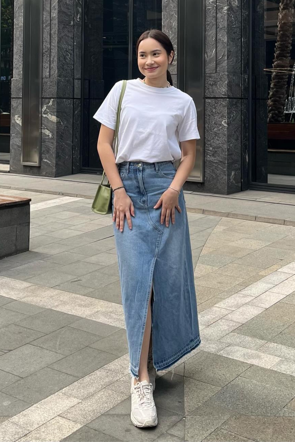 White T-Shirt + Denim Long Skirt + White Sneakers