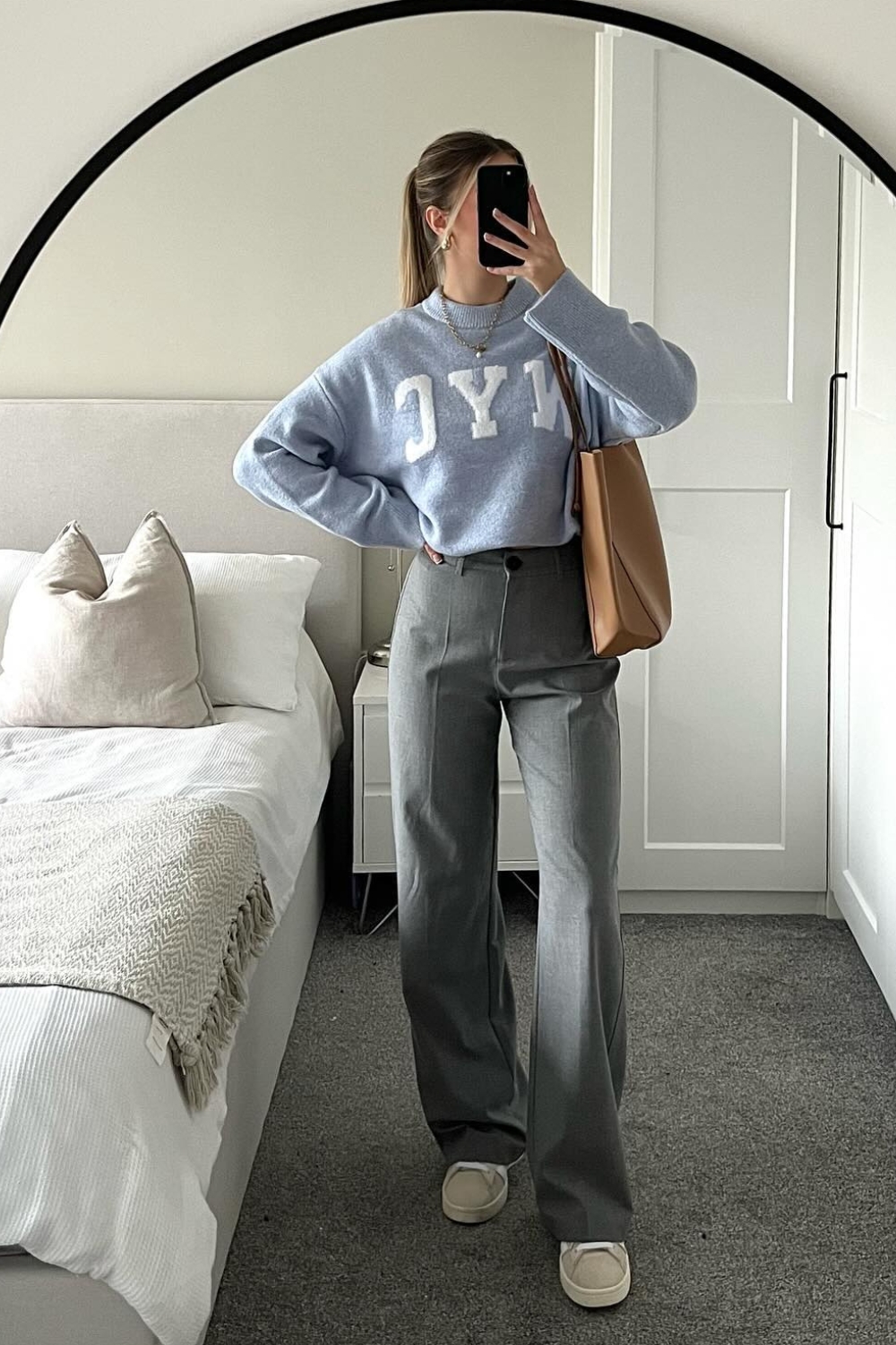 Crewneck Sweater Sweatshirt + Gray Trousers + Sneakers