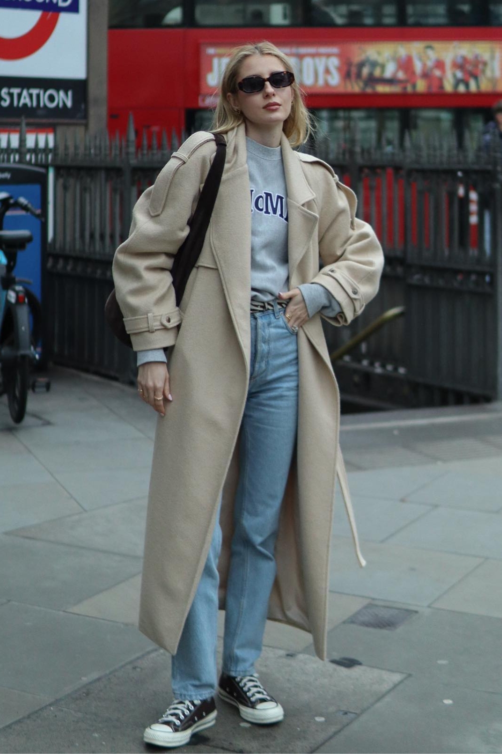 Sweatshirt + Trench Coat + Blue Jeans + Sneakers