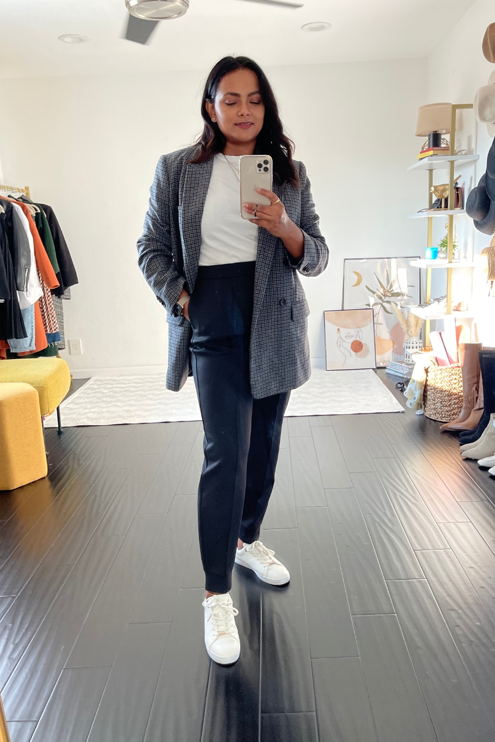 This ensemble is a perfect match for those who want to combine professionalism with athleticism. It is an example of an athletic professional outfit without sacrificing style. The shoes provide a pop of dynamic adaptability, while the blazer and pants give off a polished, businesslike vibe.