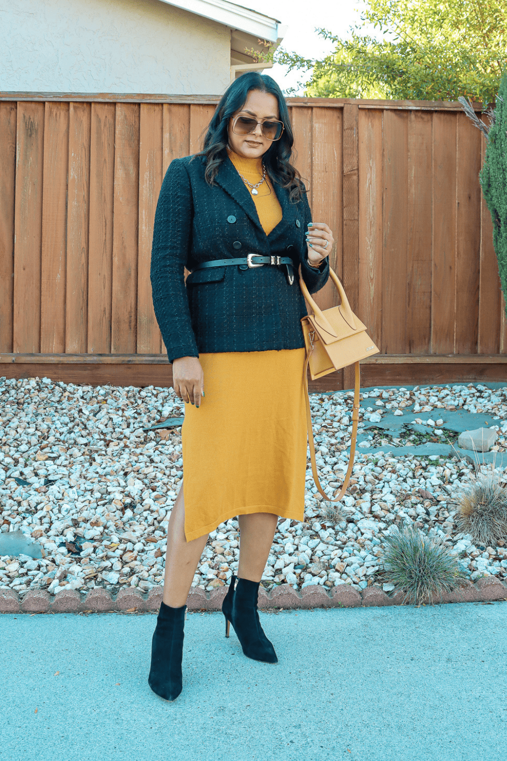 The yellow sweater dress is my favorite and I have shared another outfit with it as well. This look would be great for work where I have added a tweed blazer that also feels really comfortable and adds some pattern without and color contrast. And tweed blazer always looks classy and sophisticated because of the fabric.