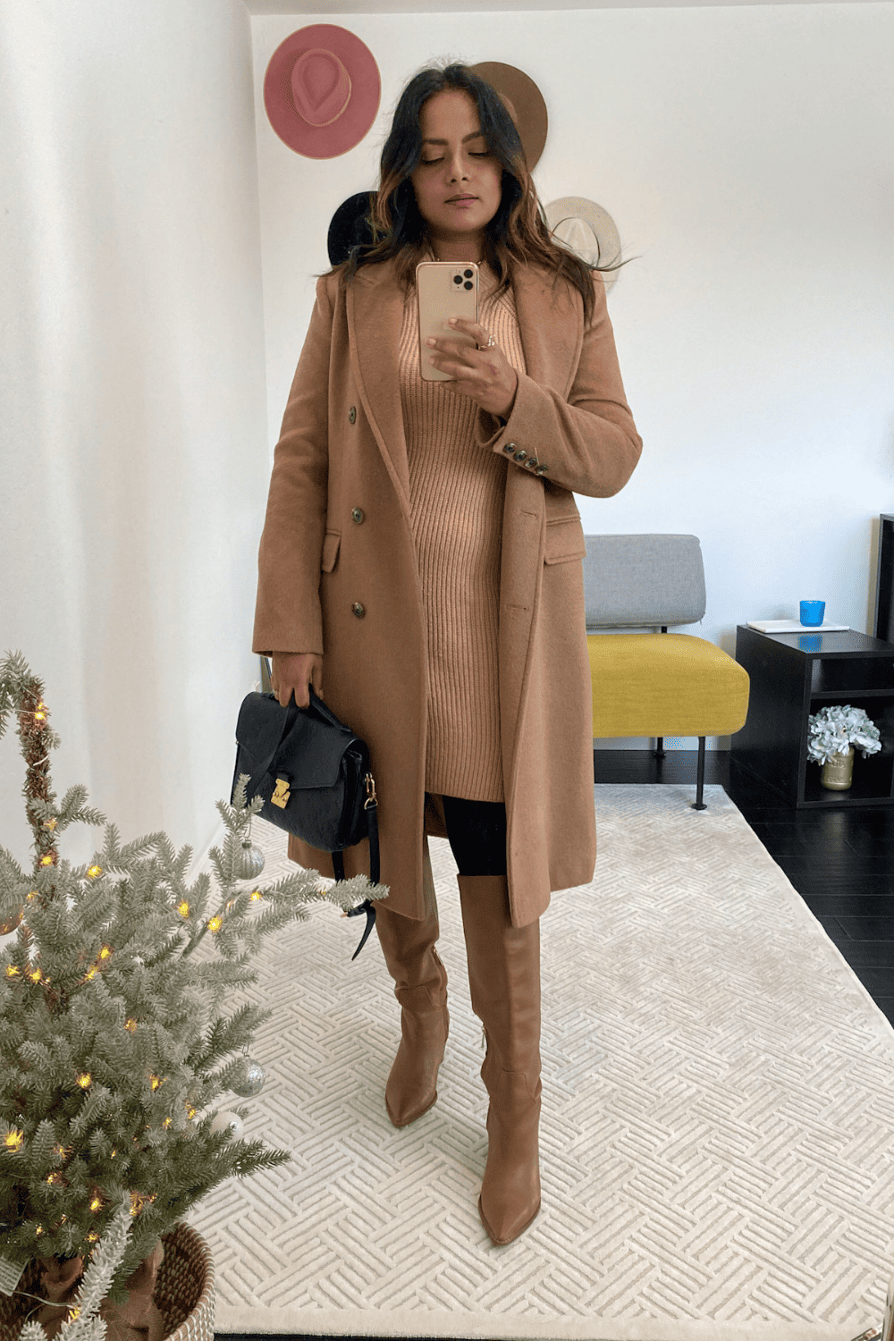 This outfit is monochromatic without being too catchy catchy. The tan knee high boots match the camel coat. And adding a brown tone thin belt completes this feminine neutral chic look.
