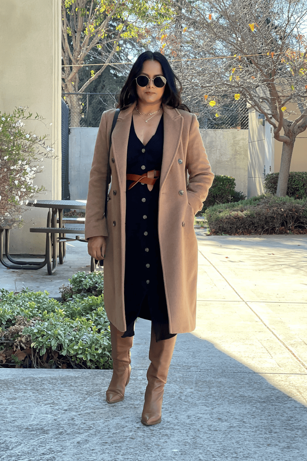 Camel Coat + Belt + Knee High Boots