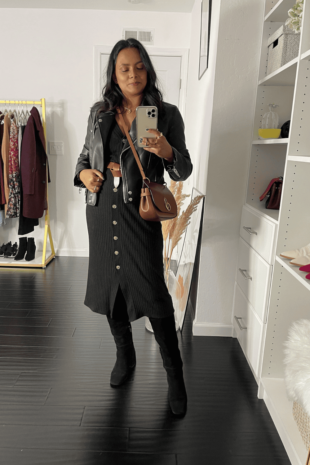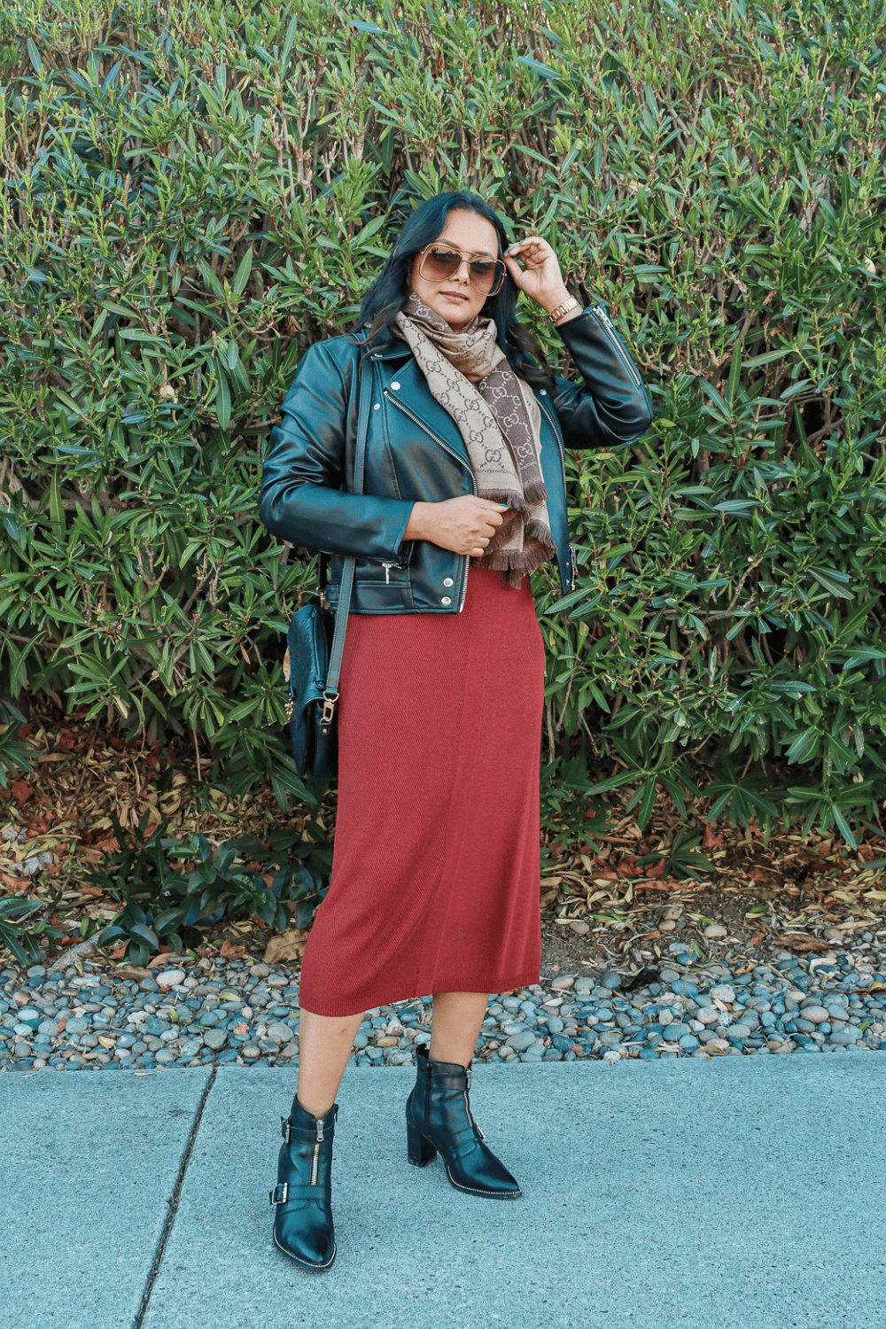 Winter and leather jackets are the best combination and in this look, I also added ankle boots which match the leather jacket with hardware details. This creates an effortless edgy look that makes this simple sweater dress stand out.
