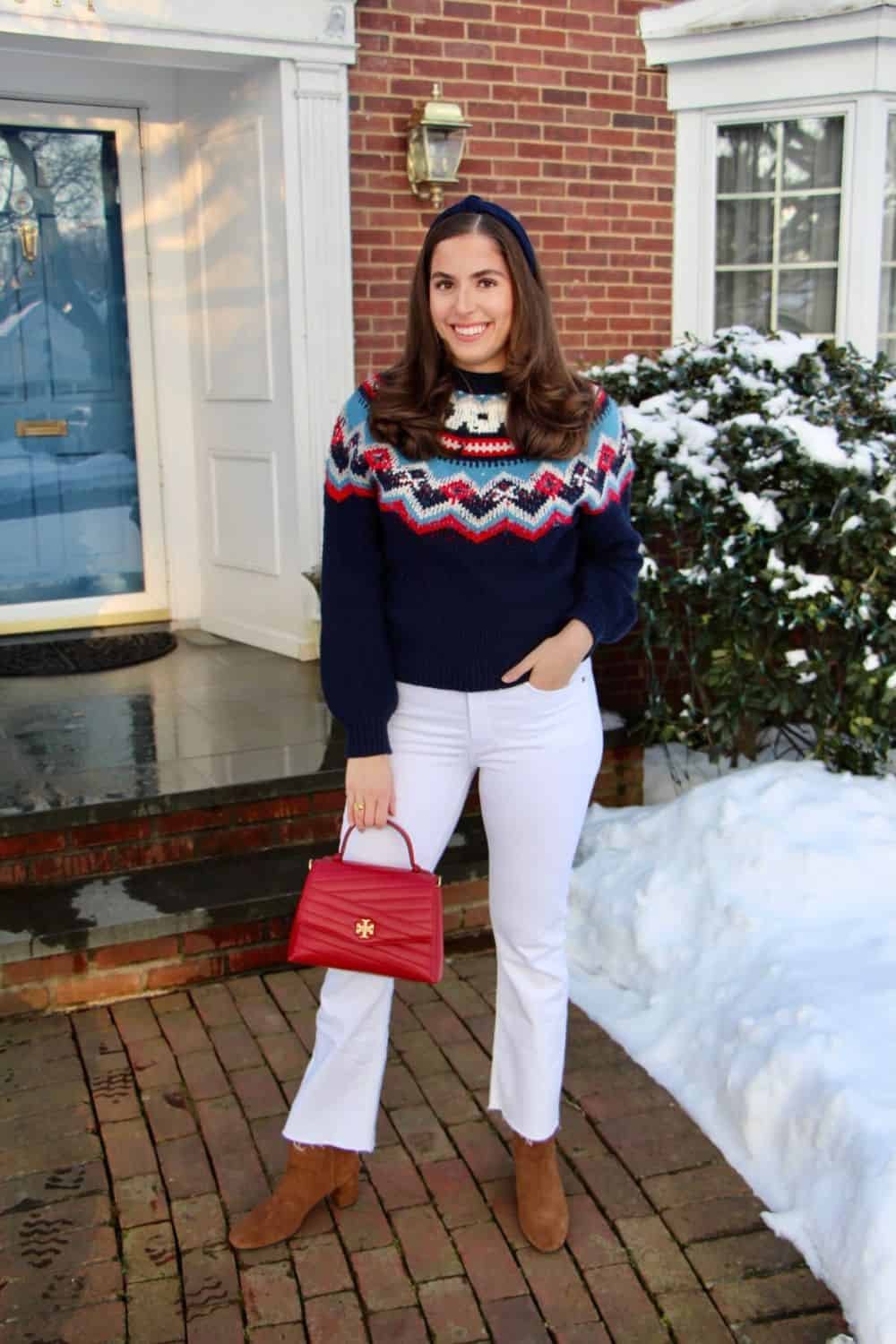 Fair Isle sweaters look so fun in the winter and you can wear them with straight leg jeans and look ready for the holiday. In fact this could easily become your holiday party outfit that is laid back but dressy with the fair isle sweaters.