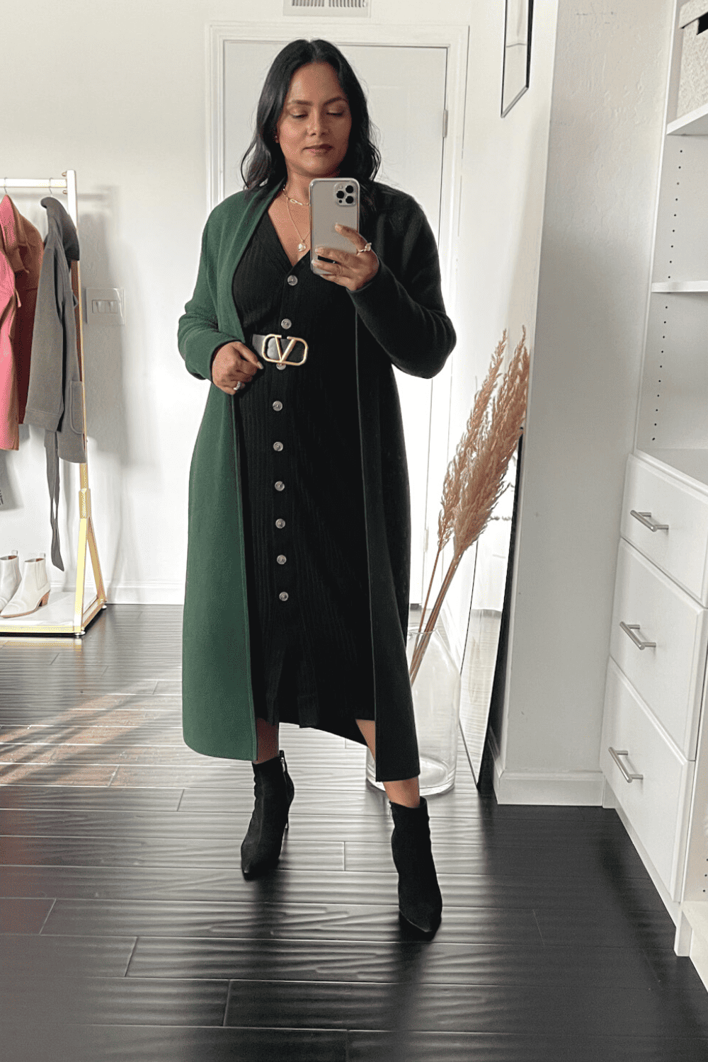 A belted puffer coat will give you the waist definition instead of a regular puffer coat since they are usually bulkier and will make you look bigger. The belt creates a waistline so you are not drowning in it.
