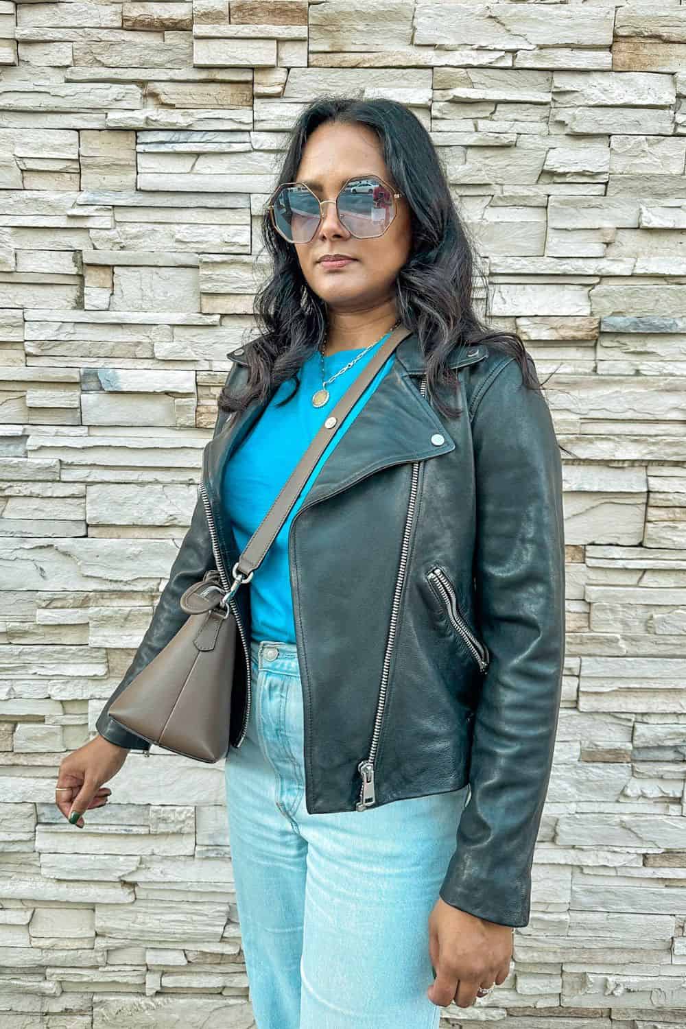 This is where instead of picking up a faux leather version, I want you to actually invite in a good quality real leather jacket that is not too tight and you can wear with t shirts, tank tops and even thick sweaters.