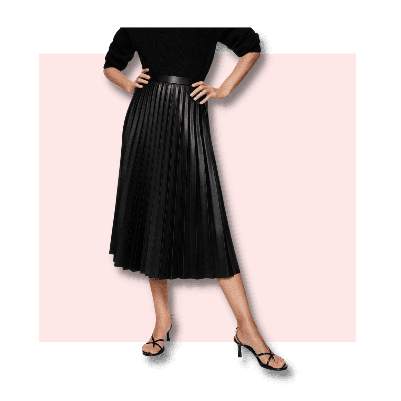 The two essential pleated midi skirts to have in your closet are a black faux leather one and a printed one.