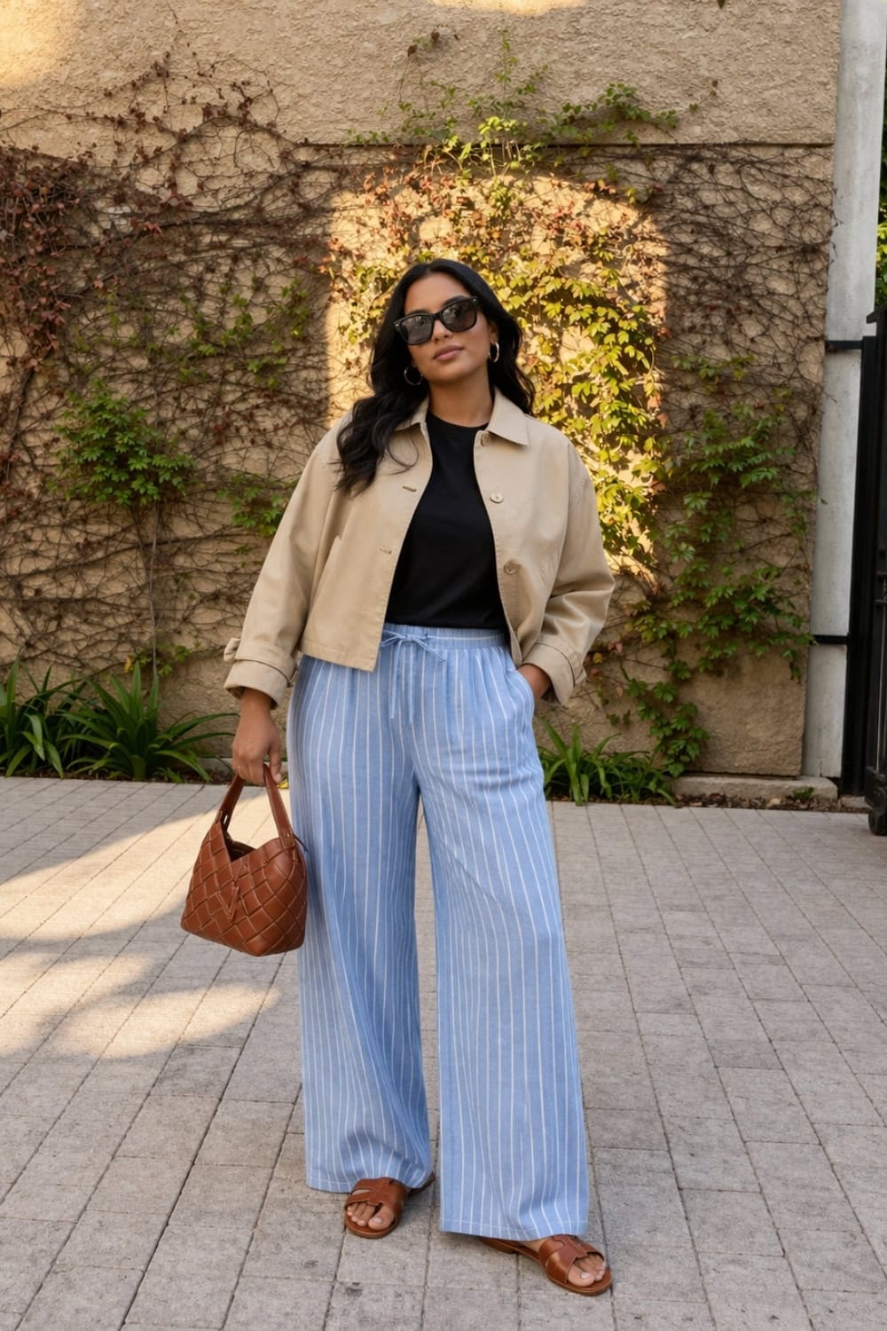 The goal is to balance the outfit, and the wide leg pants do it. If it’s too hot outside, you can totally have no layer. But adding a casual collared jacket elevates this look further.