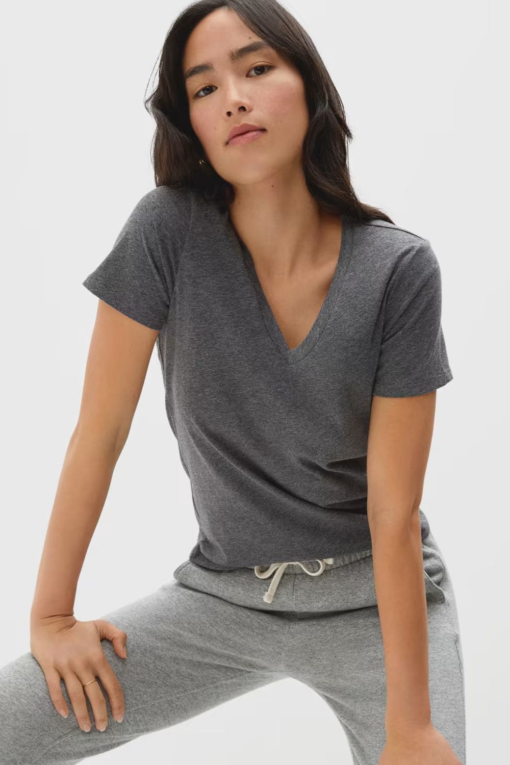 V-Neck T-Shirts are comfortable, flattering basics that can be worn formally or informally. Whether you want to wear a V-Neck T-Shirt with some leggings while running errands or some jeans and jewelry when hanging out with girlfriends, you can style this piece countless ways. However, not all bras are suitable for wear with a V-Neck T-Shirt. Because V-Necks have a plunging neckline, your bra can sometimes be visible along the neckline of the T-Shirt. To avoid this, seek a plunging neckline bra. Most standard bras have a plunging neckline, but you can find bras with an extra deep plunge that is best for wear with V-Neck T-Shirts.