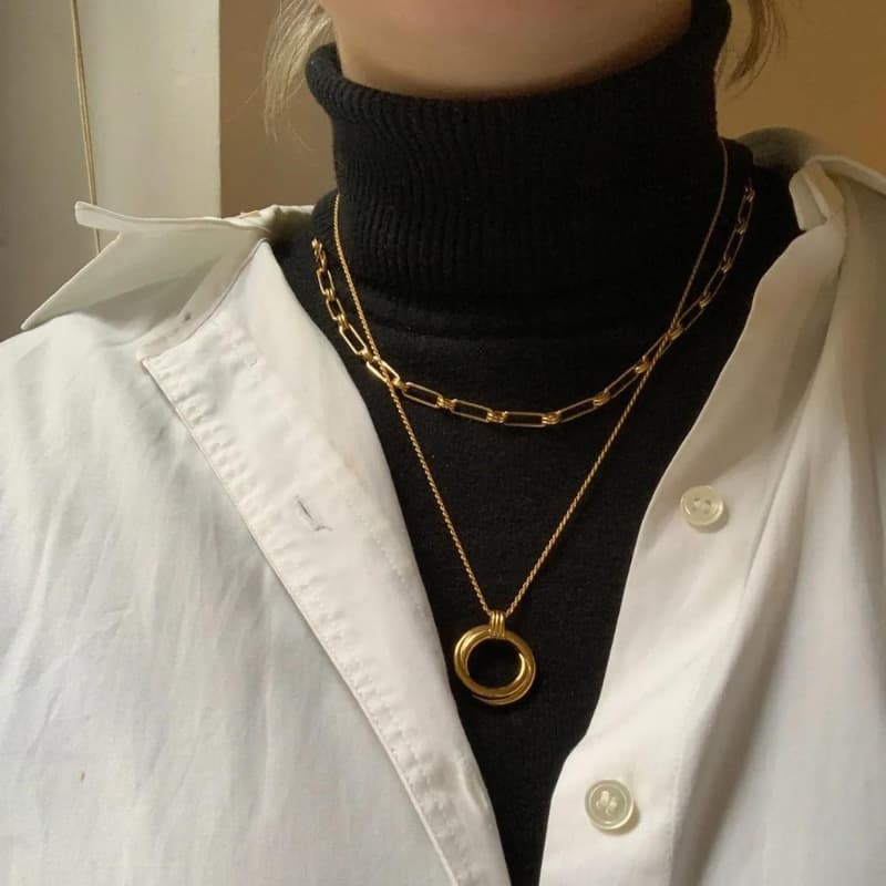 - Link chain necklaces would be perfect for these styles of sweaters. They are not as dainty, so they are visible over the turtleneck and you can find them in so many different lengths. And you can also wear them with other necklines.