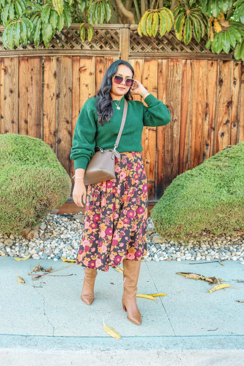 You can wear tall boots with this style of midi skirt because the prints are already distracting your eyes. I would either wear a contrasting color tall boots, or I would pick black tall boots. But in both cases they need to have some sort of heel and no round toe. Otherwise you will look frumpy and short.