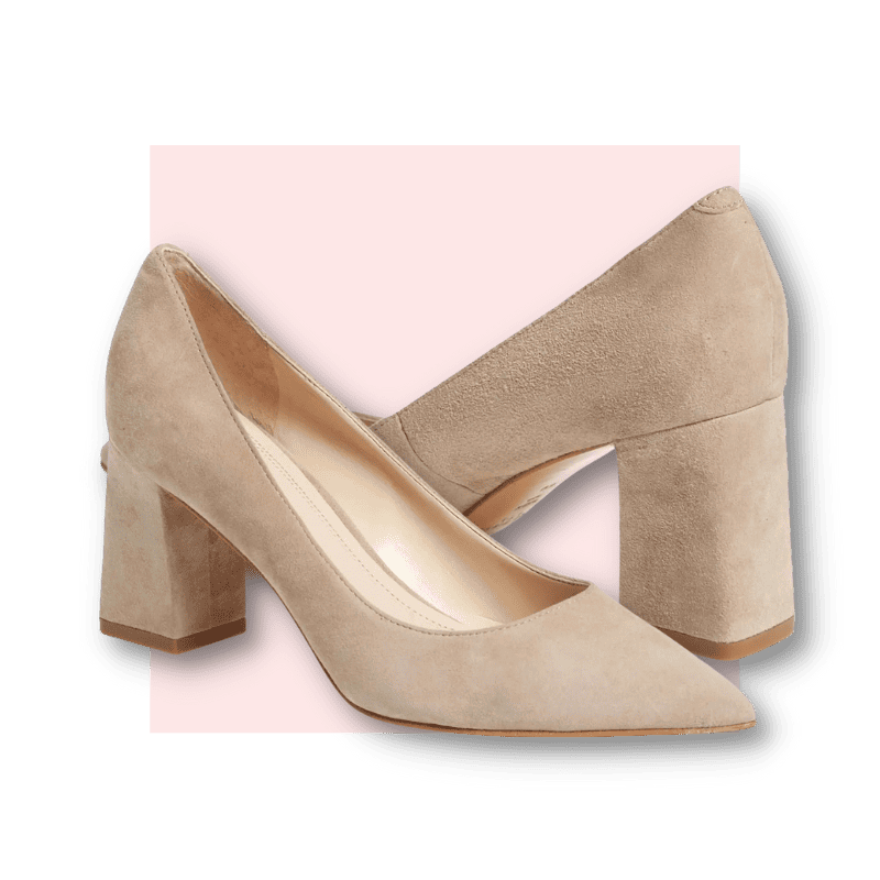 Block heels are really comfortable and these nude pumps will add some structure to the satin bias midi skirt.
