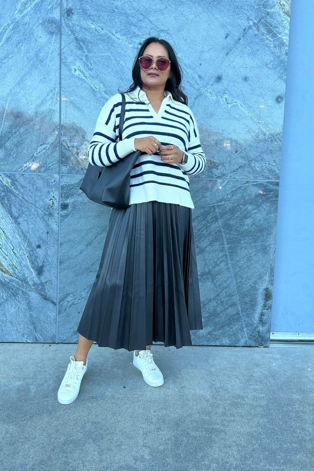 If you are wearing pleated leather midi skirts, you can easily create a contrast with white loafers and make them look sophisticated.