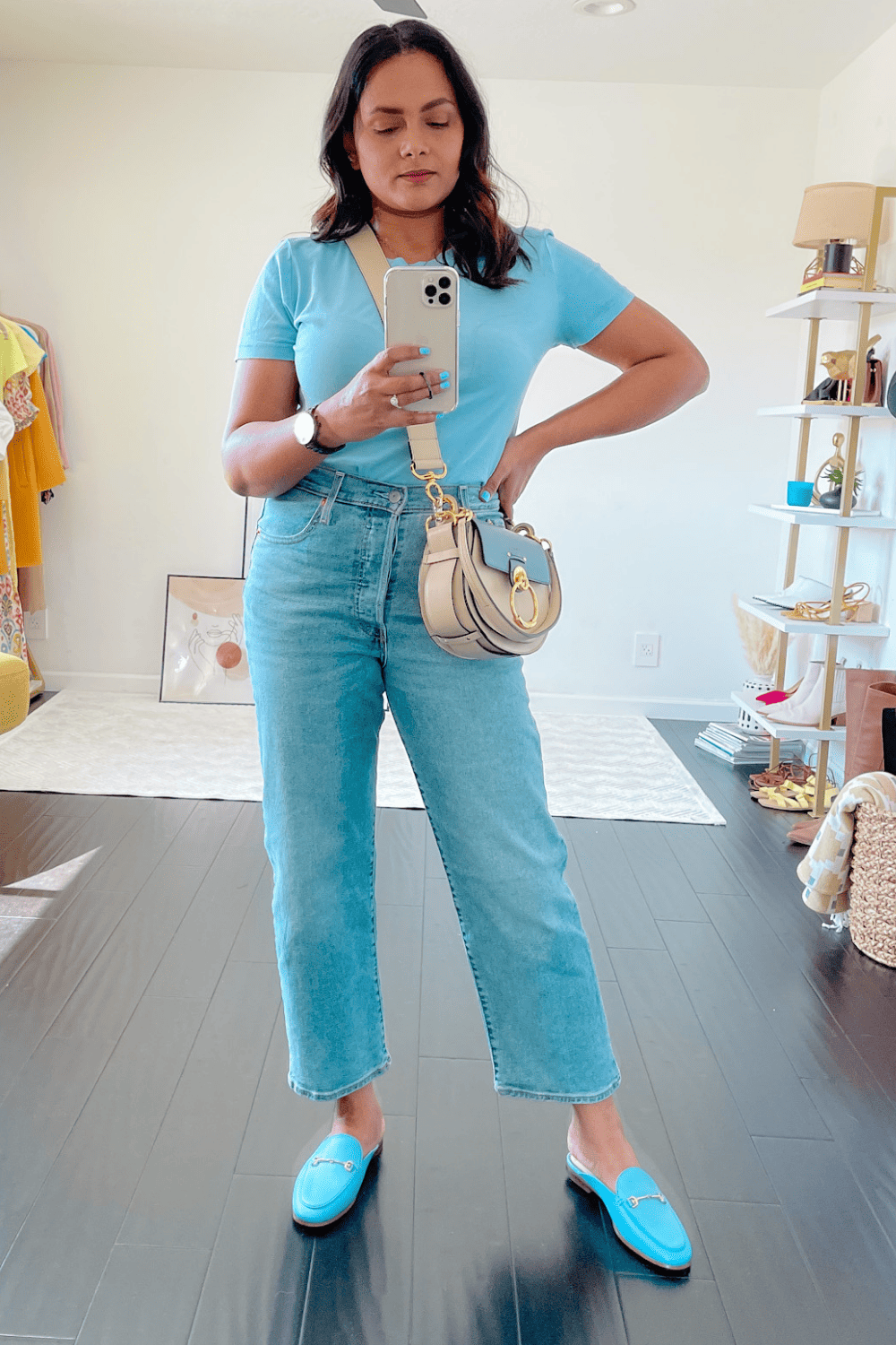 If you prefer to wear flat pumps, you can also do so. I don’t own one, so I paired these jeans with pointy toe loafer mules to give you an idea of how they would look. With the pointy toe detail of the shoes, you can add some extra length to your entire look which in turn looks more flattering.