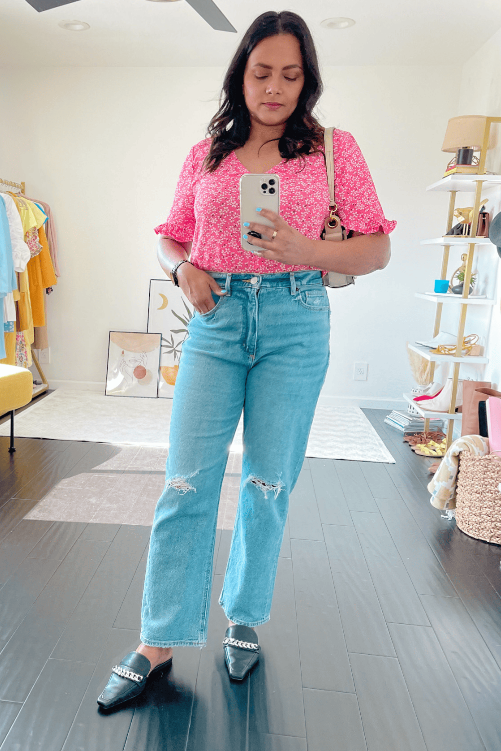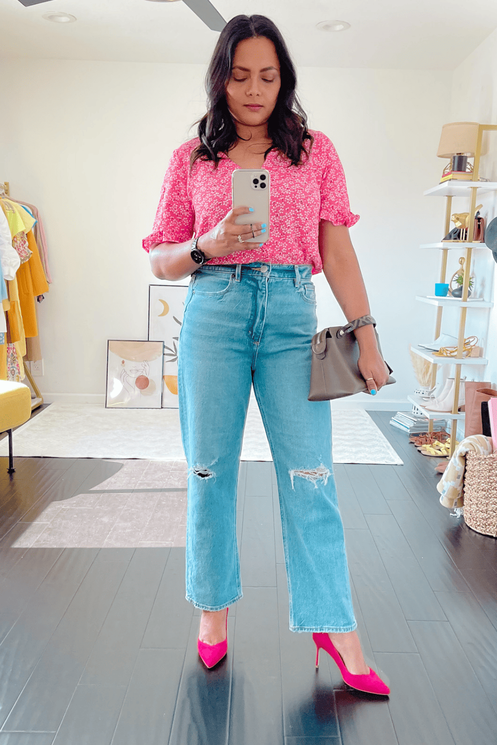 If you are planning to wear these jeans to work or you prefer to wear close toe shoes. You can absolutely wear them with pointy toe pumps. I love how pairing these pink ones from Sarah Flint which I have reviewed on the blog as well with a matching top and create and effortless date night look that I can also wear to work. I can add a blazer and I am done.