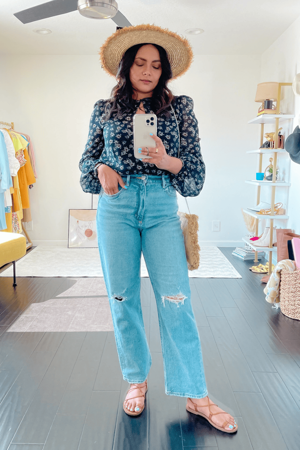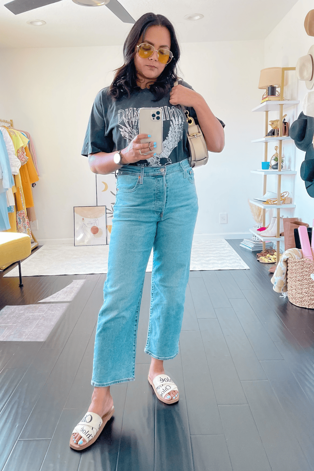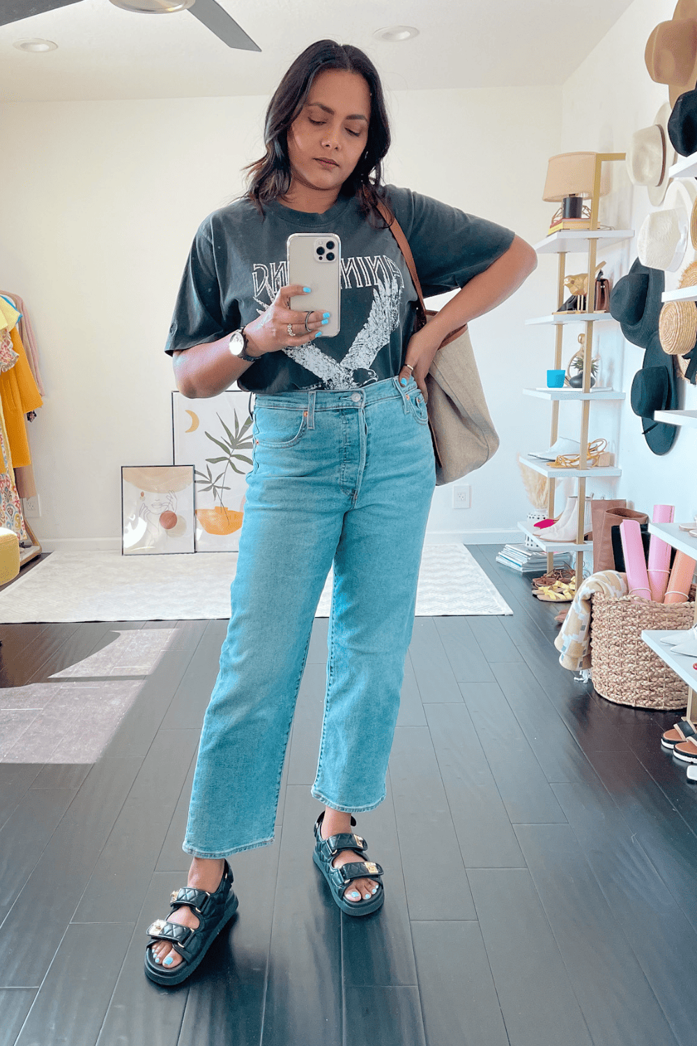 Pairing them with these straight leg jeans created the perfect modern bohemian look that I wanted to create. The almost invisible straps of the sandal shows a lot of my feel which does not make the jeans look really long. And the footwear also looks so flattering for summer where you want to wear something that is airy and breathable.