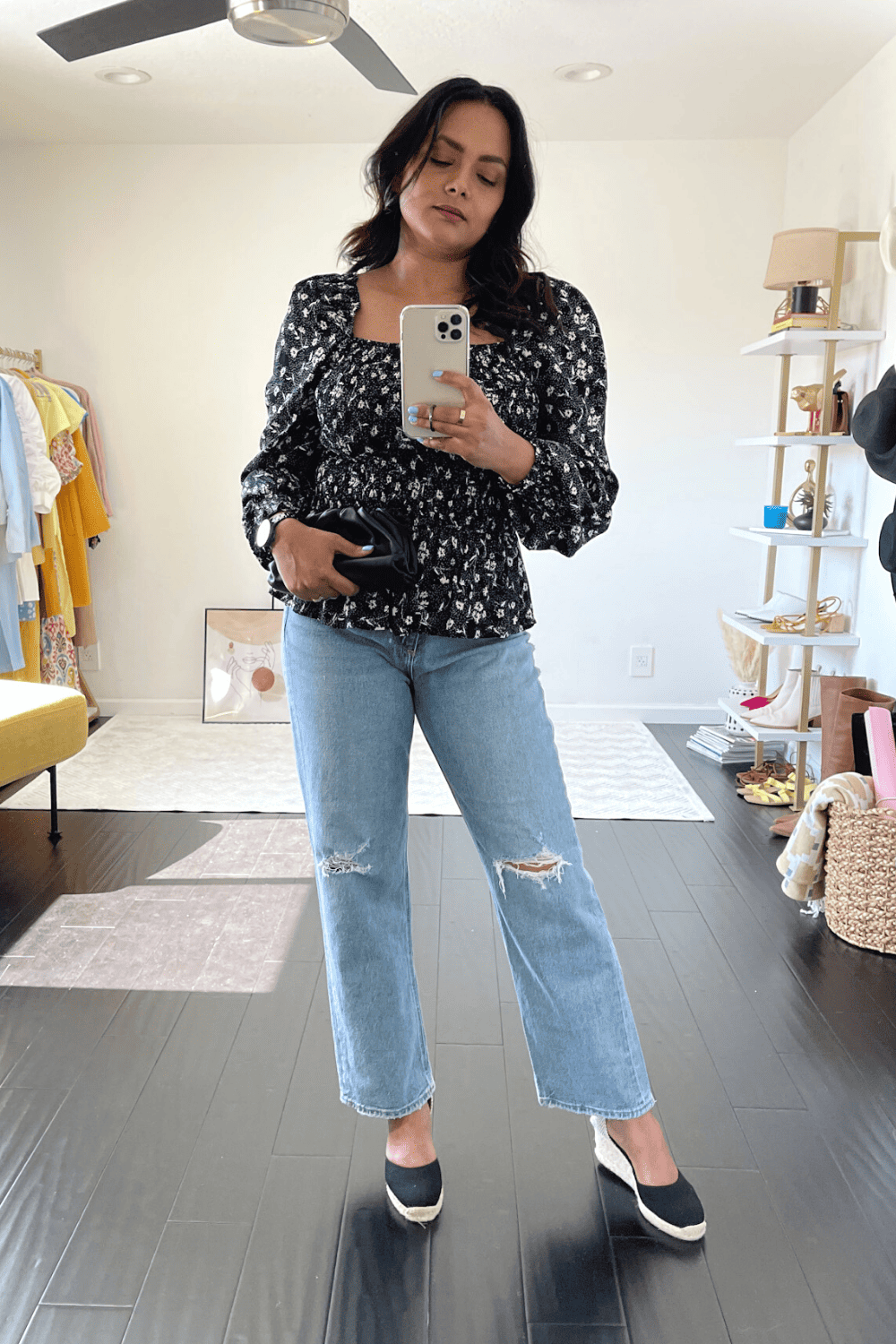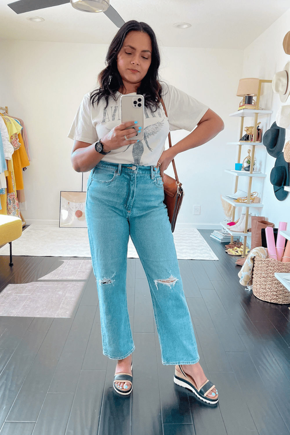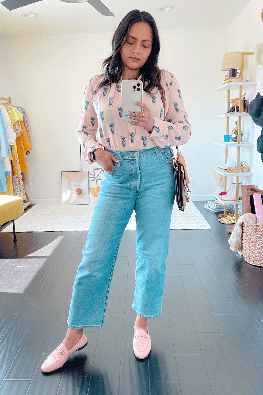 Since the jeans itself create a boxier look because of the straight leg style, the idea is to pair a footwear that will give you the appearance of height which always looks more flattering.