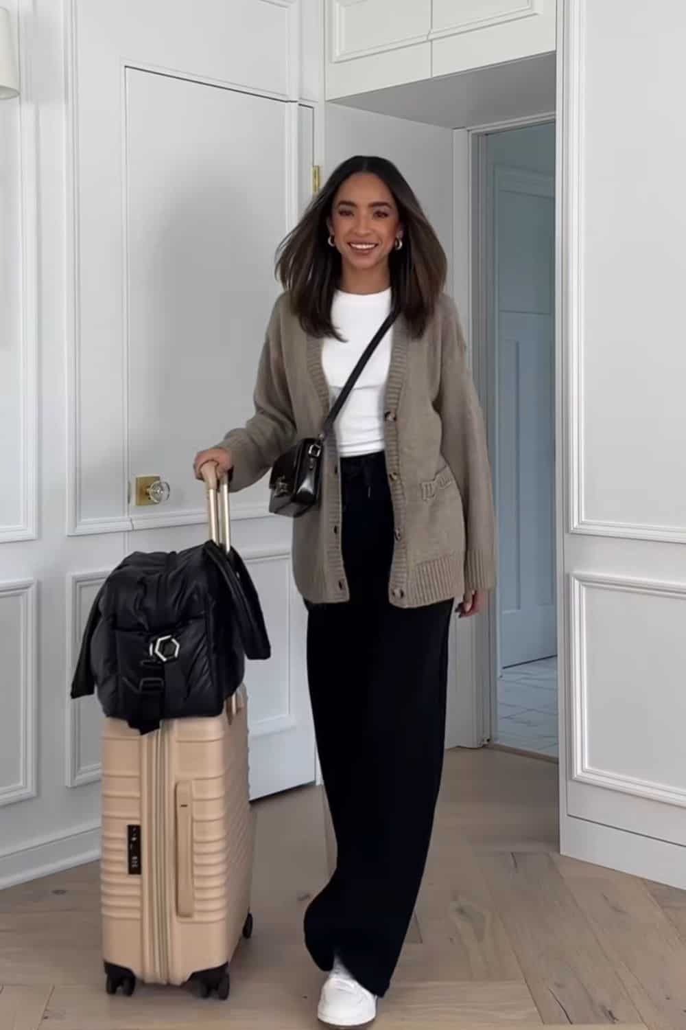 This way when you need to take off, it’s not going to be voluminous to carry. And this outfit also looks really chic for an airport travel.