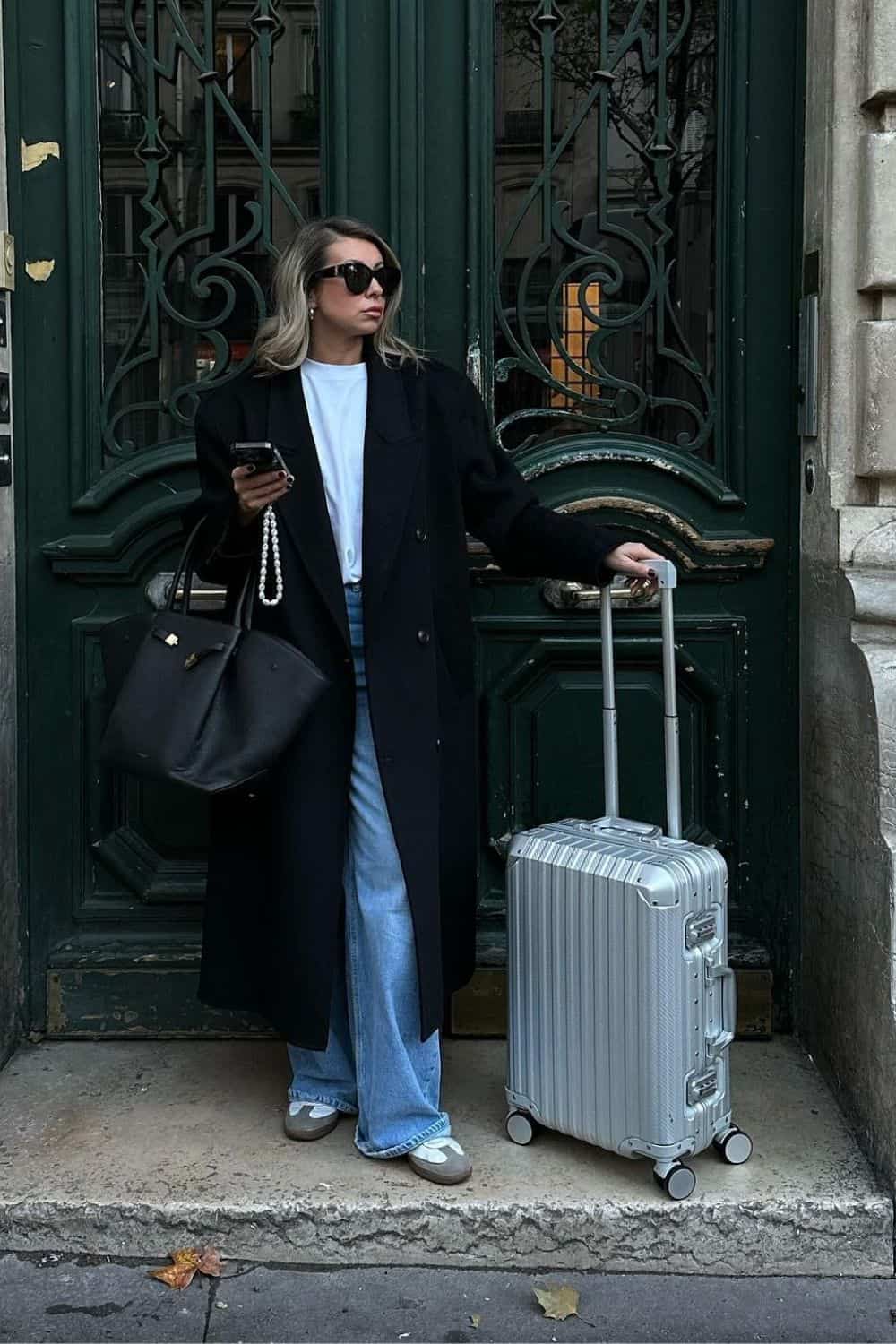 If you have a work trip or a shorter flight and you want to look classy, try this outfit. The wide keg jeans and crewneck tshirt is classy and yet laidback. Add a black wool coat and sneakers for the ultimate old money aesthetic outfit.