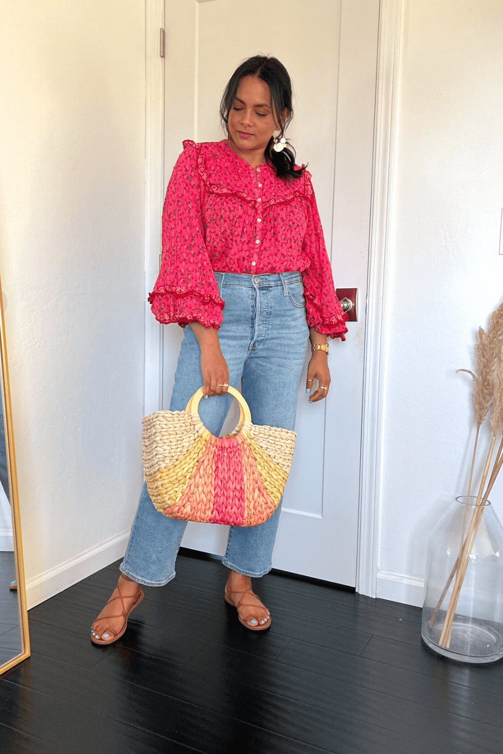 A bohemian printed shirt in a fun color would be the perfect summer top you could wear with your jeans in summer for everyday wear. But this outfit combination will also look really good for a lazy picnic in the park.