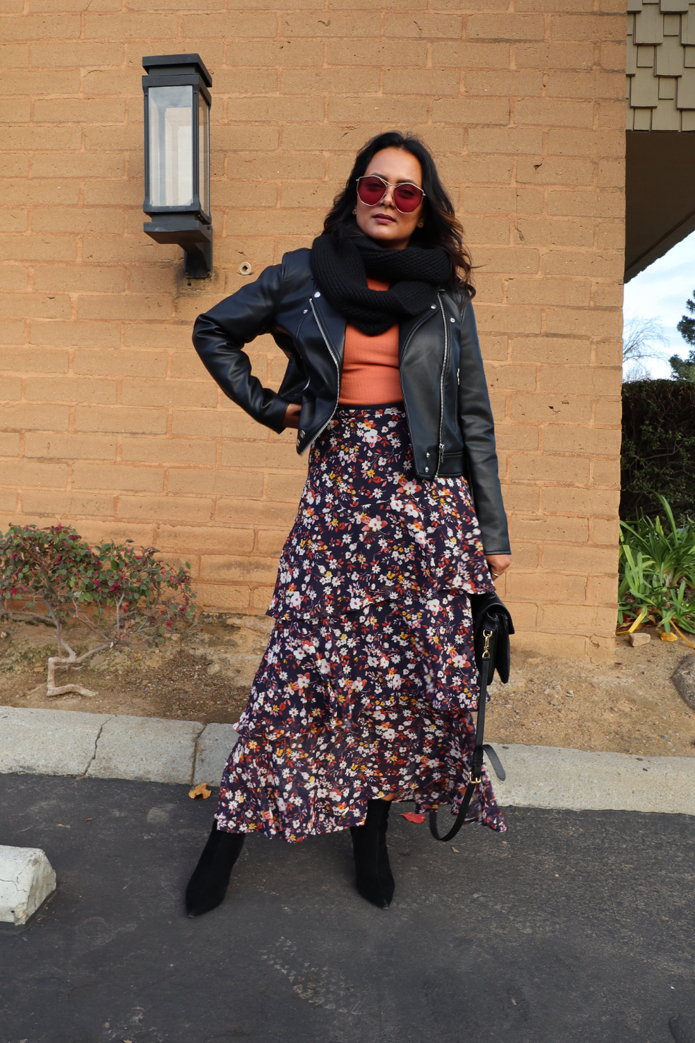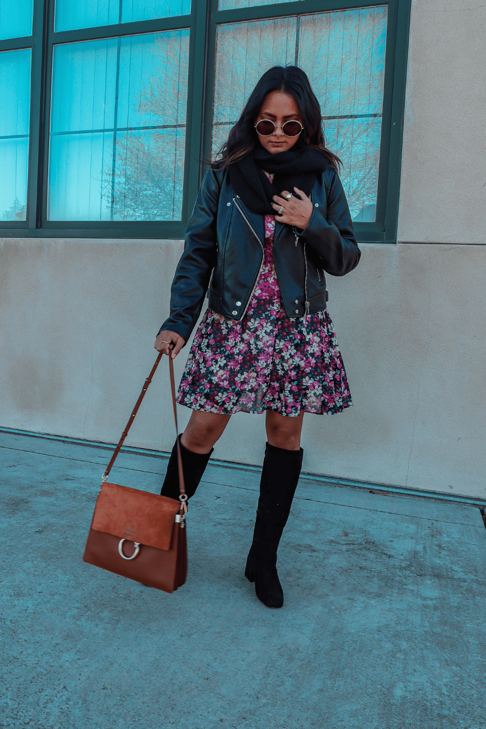 A fun way to style a black leather jacket is to pair it with a printed dresses. The all black balances all the prints and makes this outfit wearable in the colder months. If you struggle wearing floral dresses in fall and winter, you can start with this.