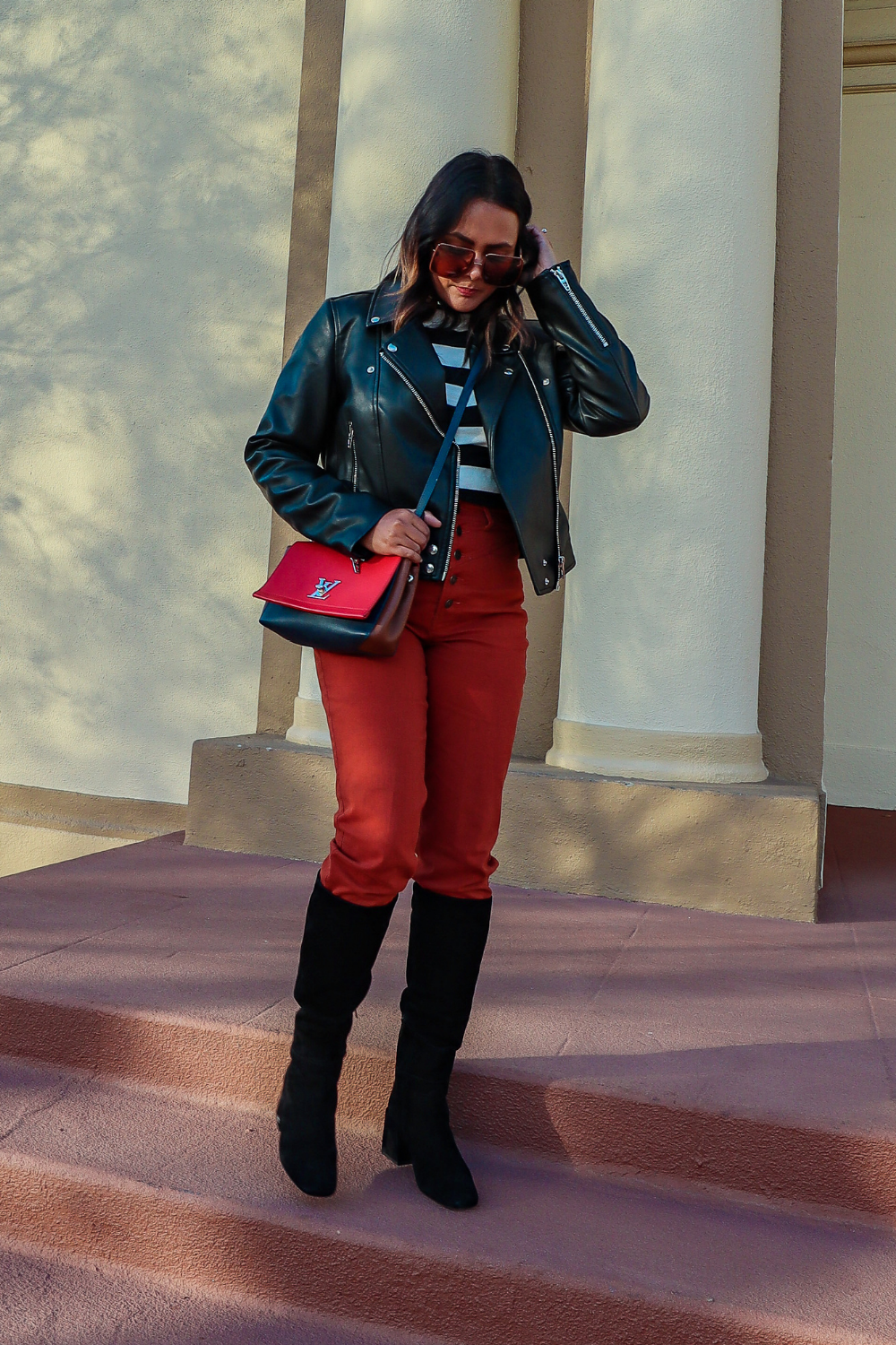 You can also wear colored pants with a black leather jacket. The trick here to make this outfit look classy and chic is to keep the color tone of the top matching.