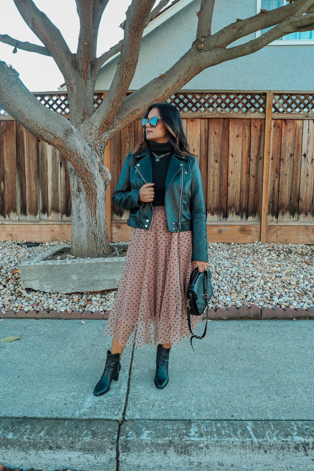 But this tulle skirt is neutral with polka dots which makes it really versatile and I have worn it in so many ways. But I love how this leather jacket outfit turned out with ankle boots.