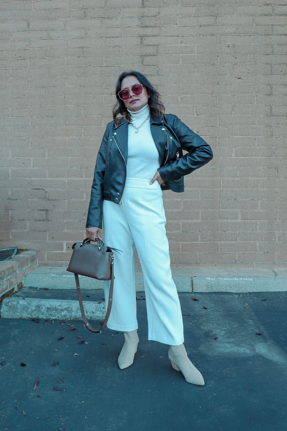 All white outfit with a black leather jacket looks absolutely fantastic specially when you are wearing white pants. You can start this outfit with white t shirt in slightly warmer weather. And as the weather gets cooler you can swap with a white sweater or a white turtleneck.
