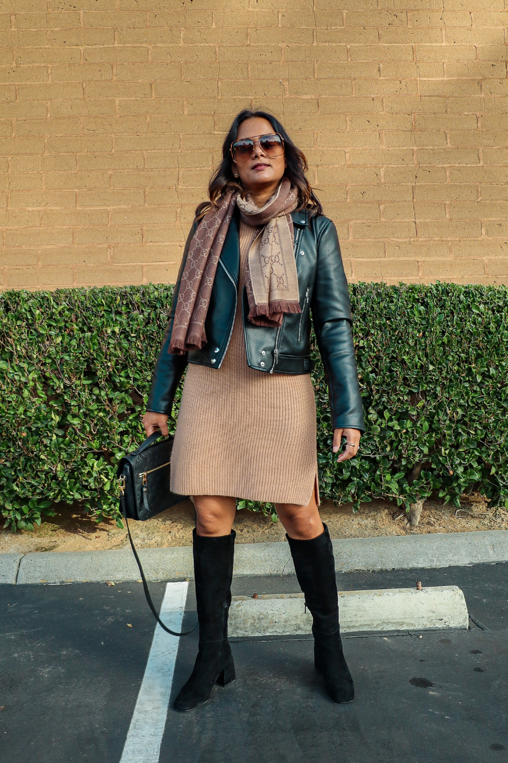 You can create a similar look with a short sweater dress as well. Add a lighter tone sweater dress with black leather jacket and black tall boots.