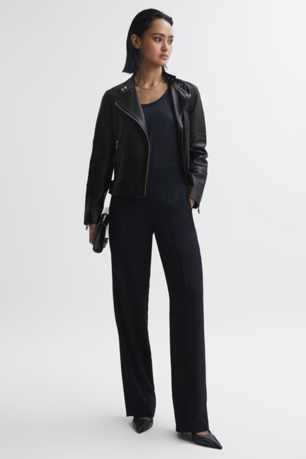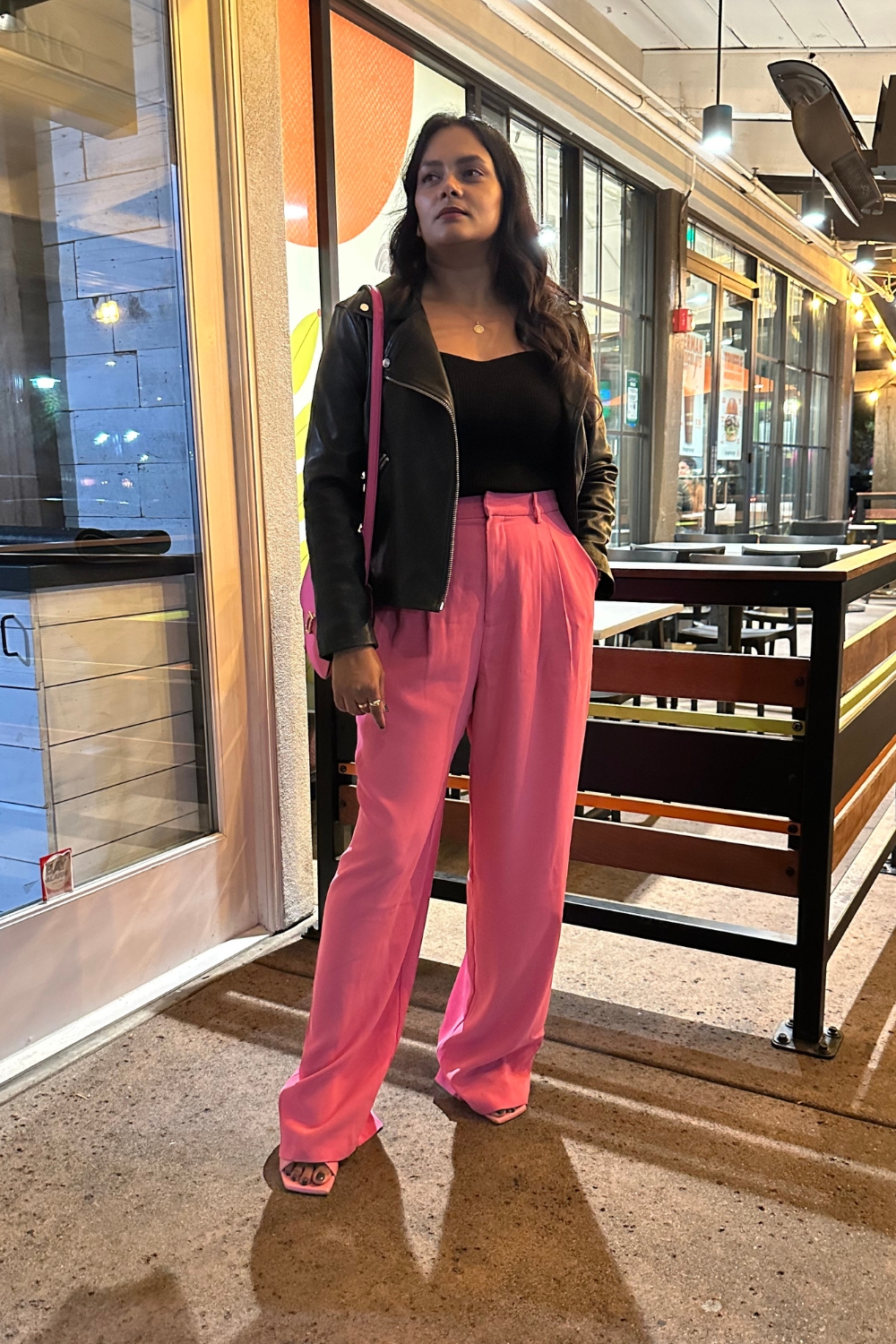 Black trousers are an all year must have for every woman. You can wear it in so many ways. Pairing it with a leather jacket gives you that ultimate smart casual work wear look which is not too polished neither too edgy.