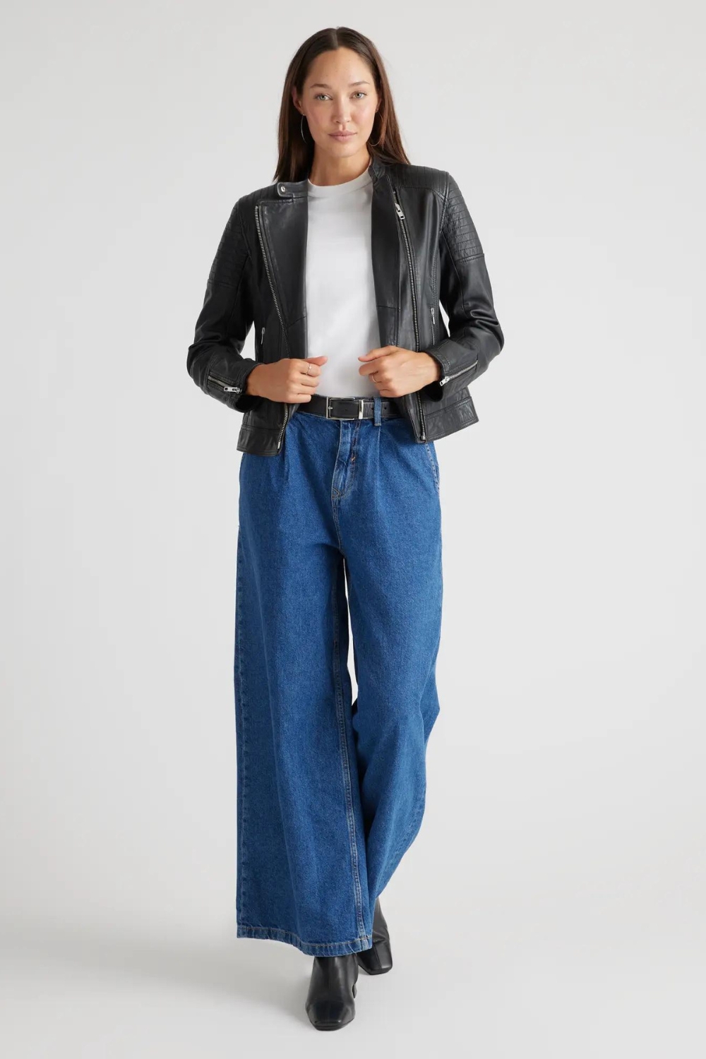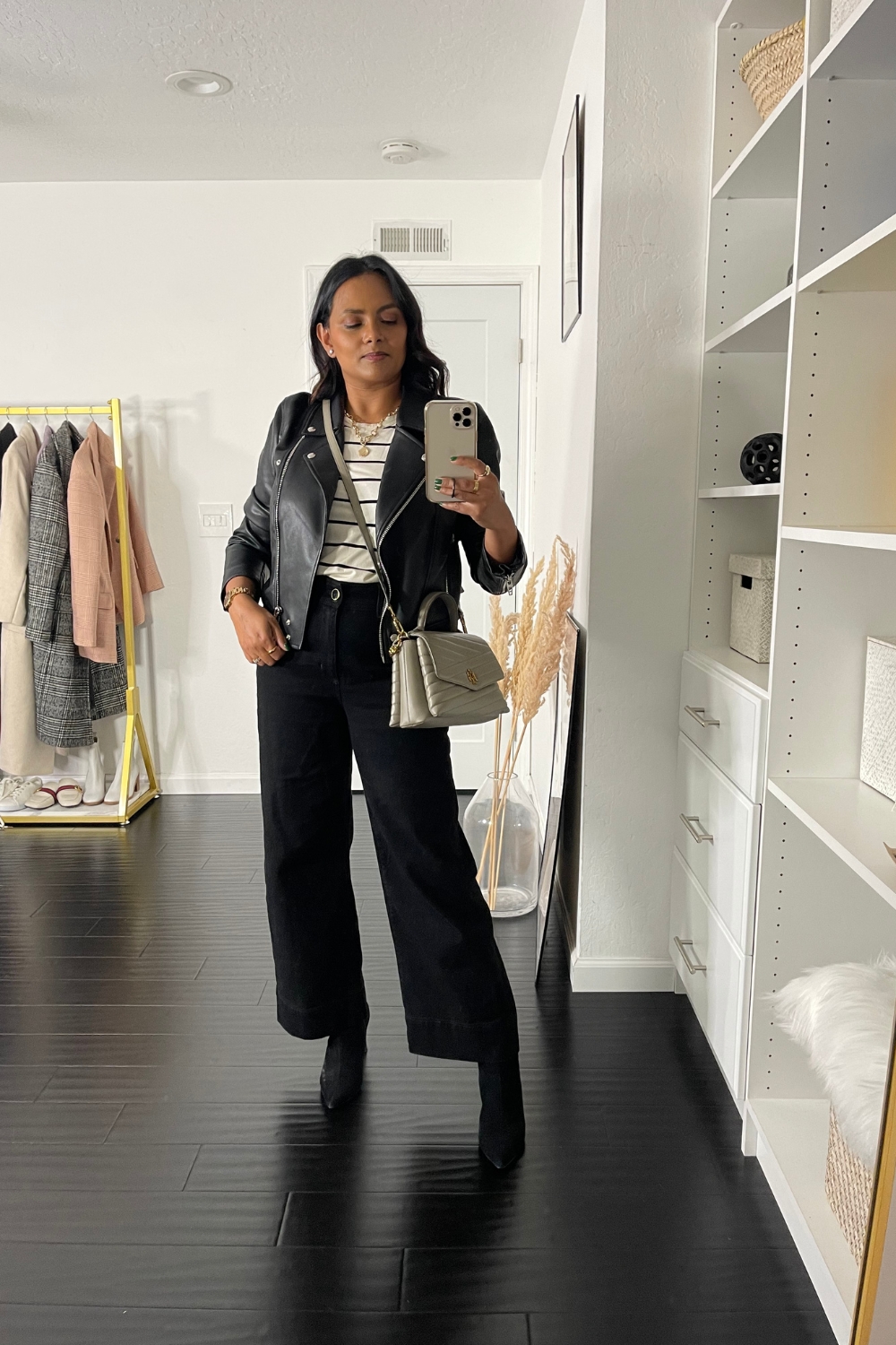 This is the easiest way to elevate your basic jeans and leather jacket outfit. Wide leg jeans are great for cold weather, because you can wear all sorts of boots with them.