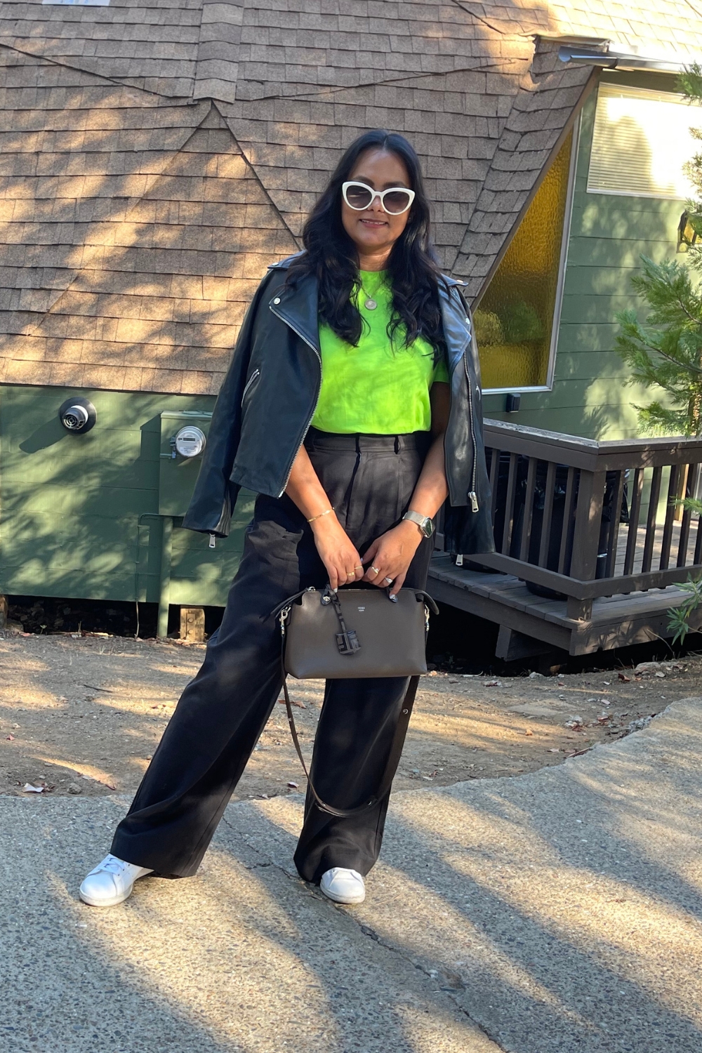 This outfit looks like a suit style but with a black leather jacket. Pair your favorite black pants and a colored top for a fun twist to the outfit. And a black leather jacket to create a cohesive outfit.