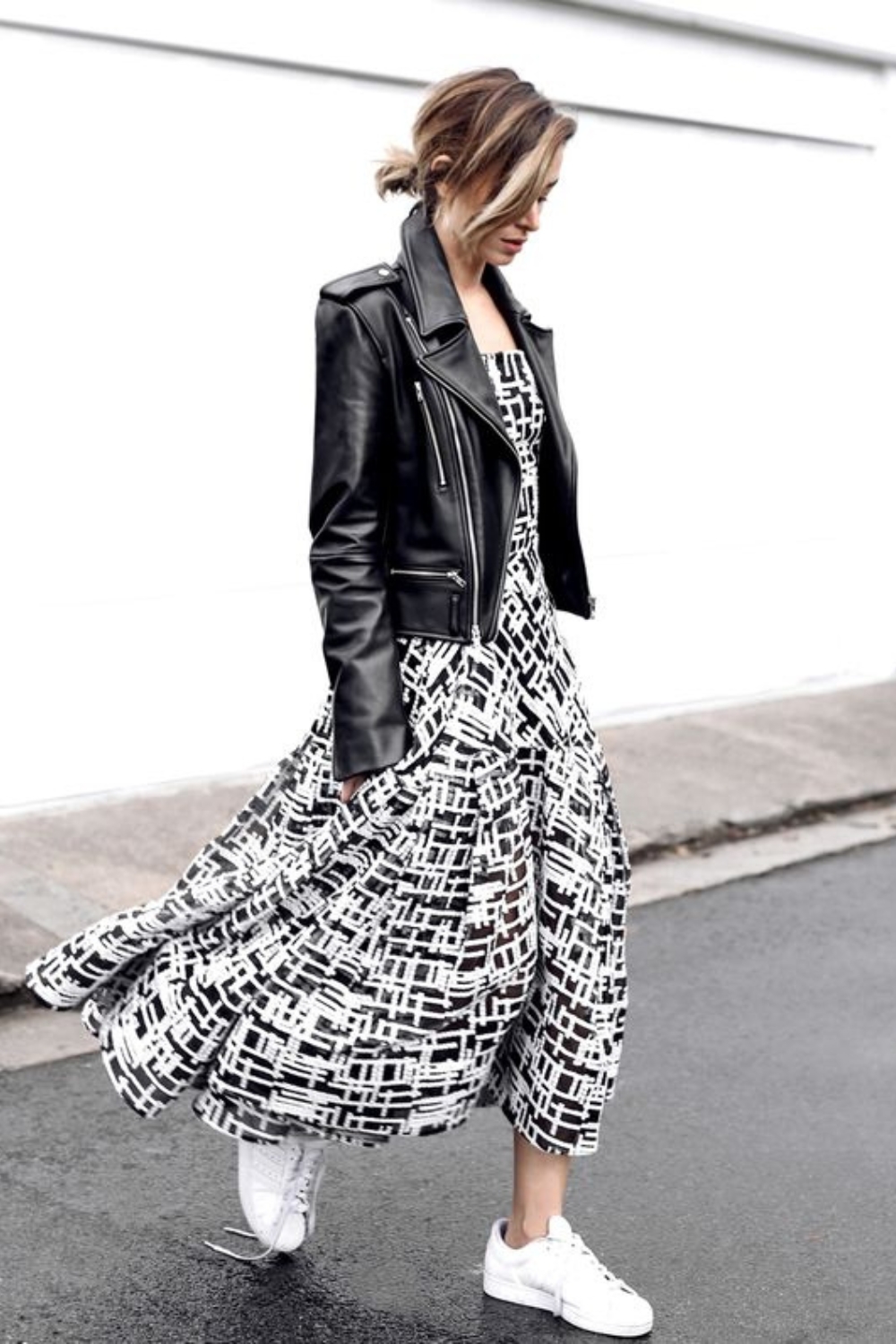 Want a casual yet chic outfit that you can wear everyday? A maxi dress paired with a black leather jacket and white leather sneakers will be perfect for daily wear. The feminine style of the dress will balance the edginess of the jacket.
