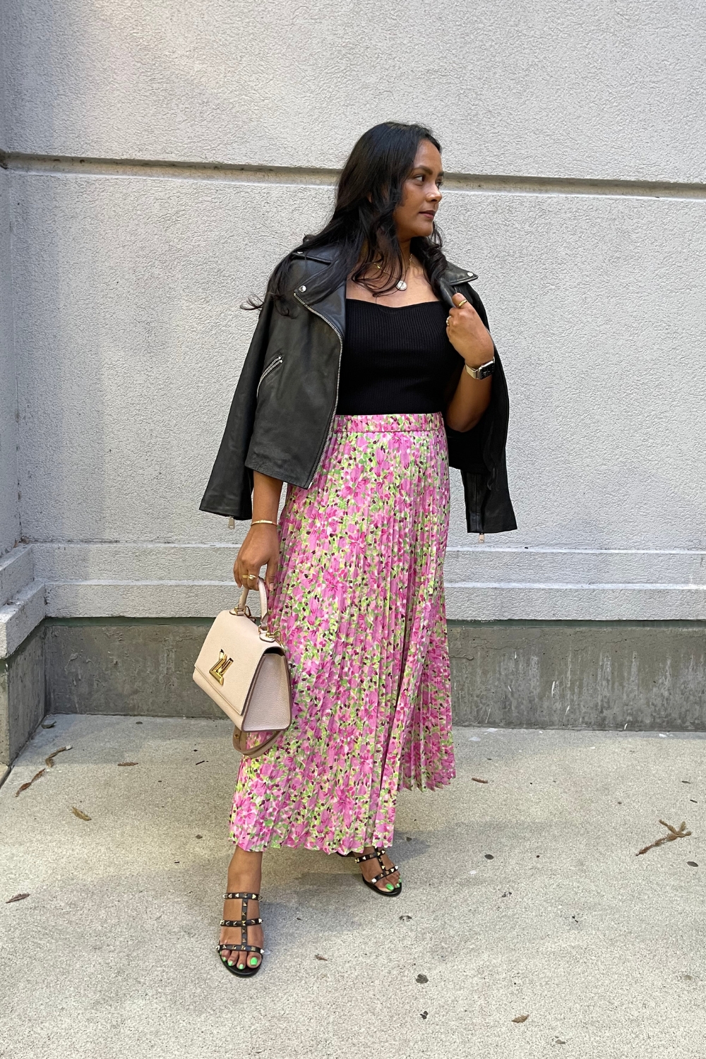 Want to create a date night outfit , try a printed pleated skirt with black top and sandals. And add your black leather jacket to it.