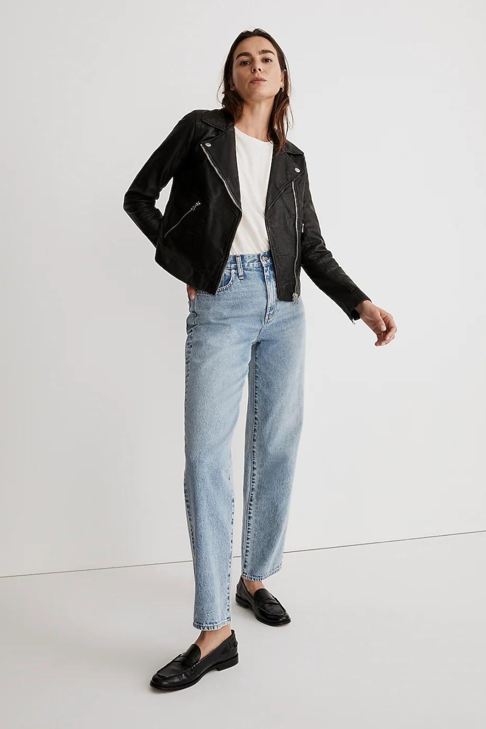 Straight leg jeans is another awesome bottom you can pair with a black leather jacket. the straight leg style makes the jeans effortless and classy as they are not body hugging.
